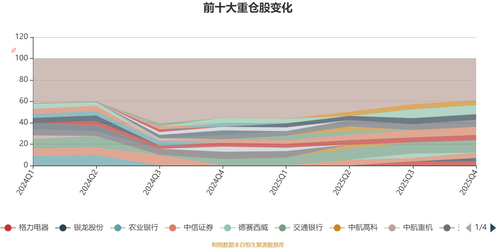 截至2025年四季度末,基金十大重仓股分别是交通银行、长江电力、工商银行、海尔智家、星宇股份、中信证券、伊利股份、三一重工、格力电器、银龙股份。