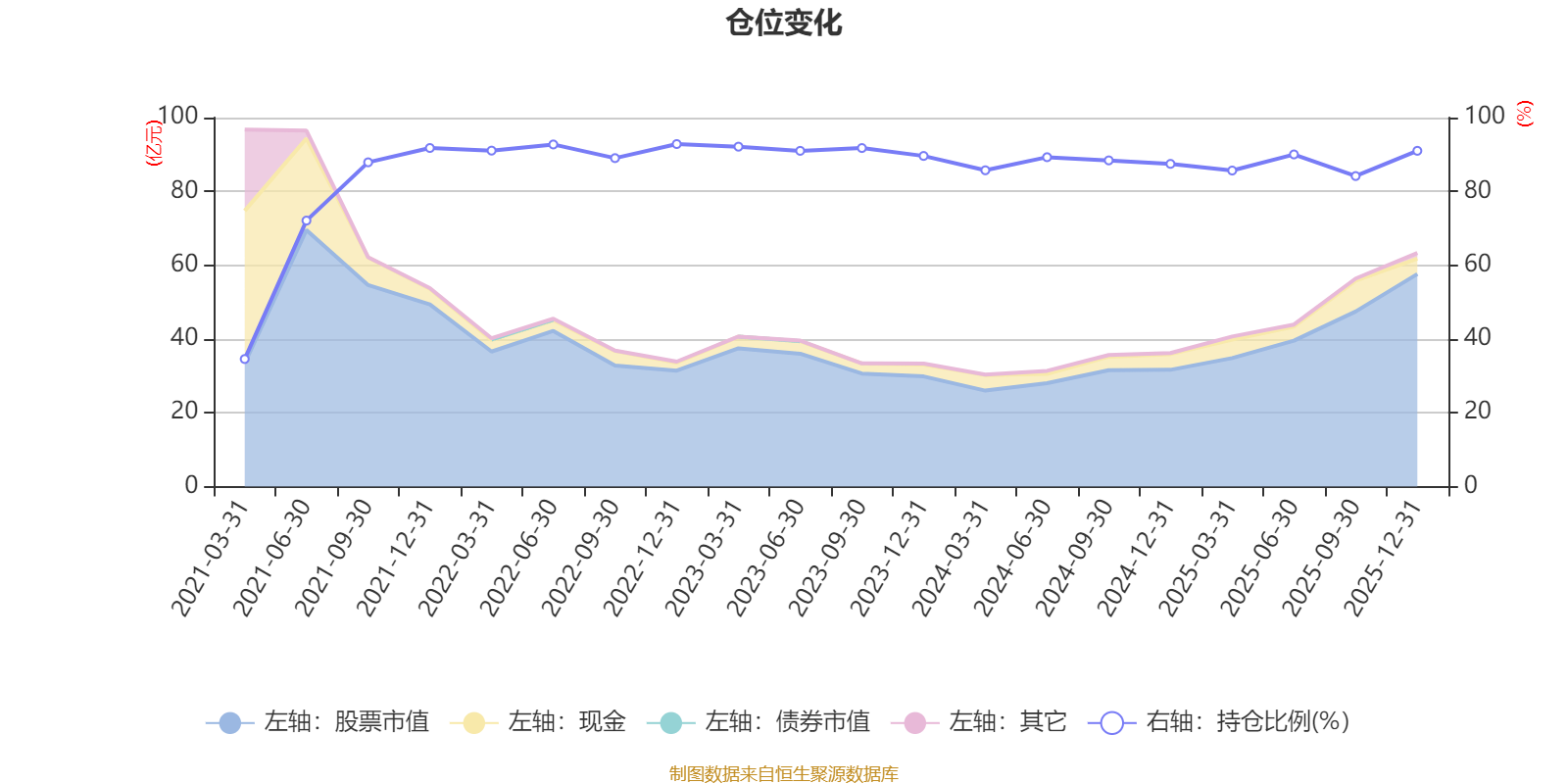 据定期报告数据统计,近三年平均股票仓位为88.85%,同类平均为88.36%。2022年末基金达到92.83%的最高仓位,2021年一季度末最低,为34.57%。