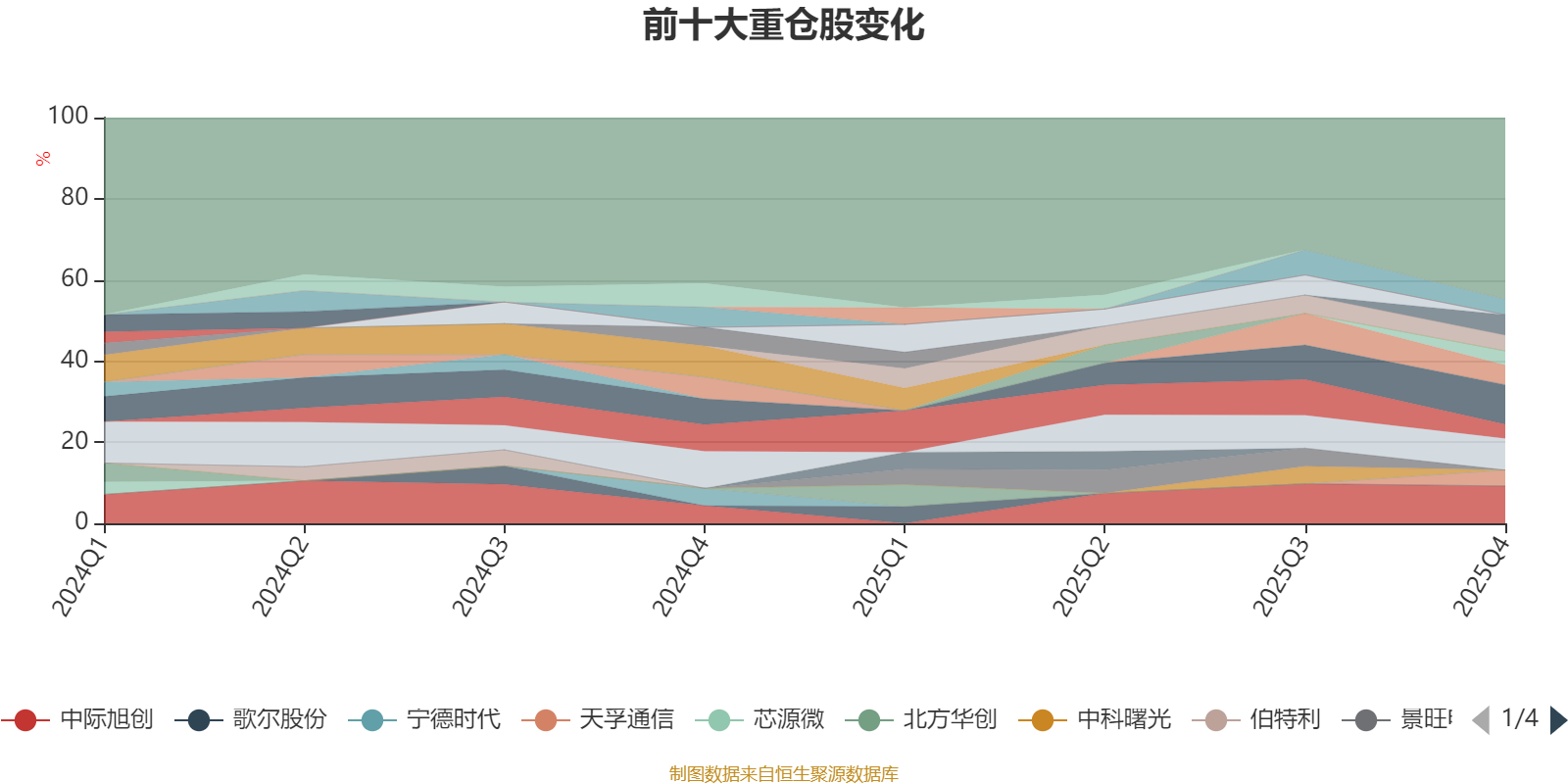 基金管理人在四季报中表示,本基金持仓结构跟随产业发展调整:我们继续看好人工智能海内外发展进展,对海外算力板块维持高仓位配置,加仓了国产算力板块,我们聚焦产业链紧缺的光模块、PCB(印制电路板)、存储产业链、先进制程算力芯片产业链;我们仍然看好国内互联网巨头在 AI 的布局,但是考虑到业绩兑现仍需时间,我们小幅减仓了互联网龙头企业;我们沿着 AI 供给缺口扩大的方向,逐步布局光纤光缆、液冷、储能等方向。2026 年我们认为很多新的下游会逐步出现大的变化,从 0 到 1 出现巨大的变化,我们小幅度布局了商业航天、机器人等领域相关标的。
