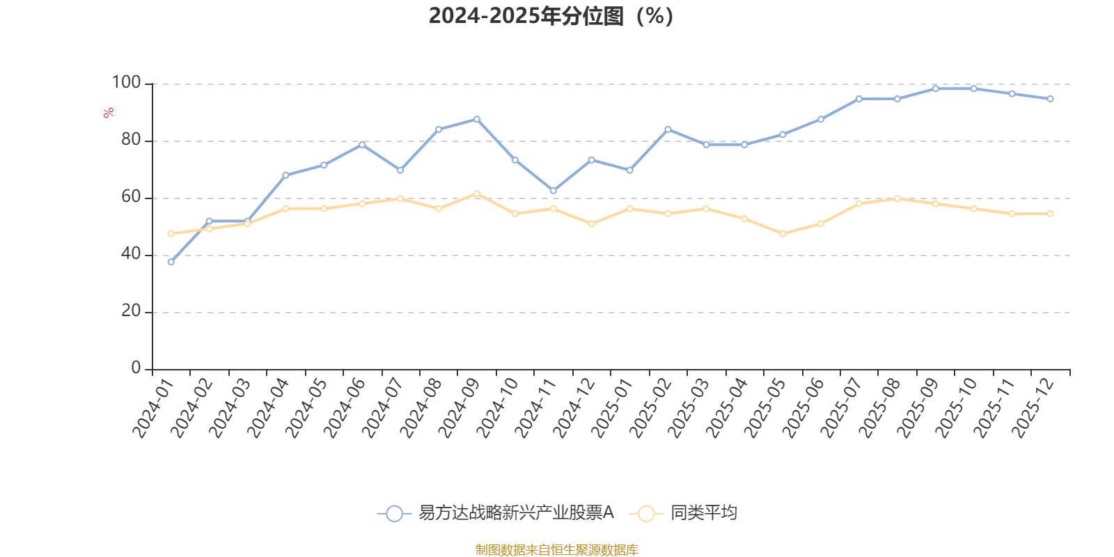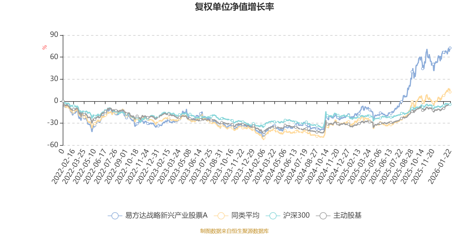 截至1月22日,易方达战略新兴产业股票A近三个月复权单位净值增长率为12.76%,位于同类可比基金40/63;近半年复权单位净值增长率为73.71%,位于同类可比基金12/63;近一年复权单位净值增长率为107.22%,位于同类可比基金1/62;近三年复权单位净值增长率为141.61%,位于同类可比基金1/52。