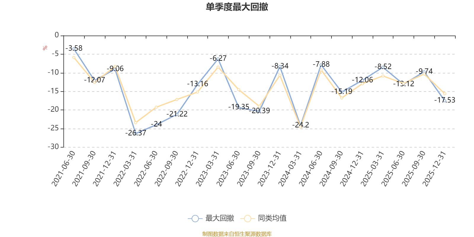截至1月21日,基金近三年最大回撤为43.5%,同类可比基金排名25/52。单季度最大回撤出现在2022年一季度,为26.37%。