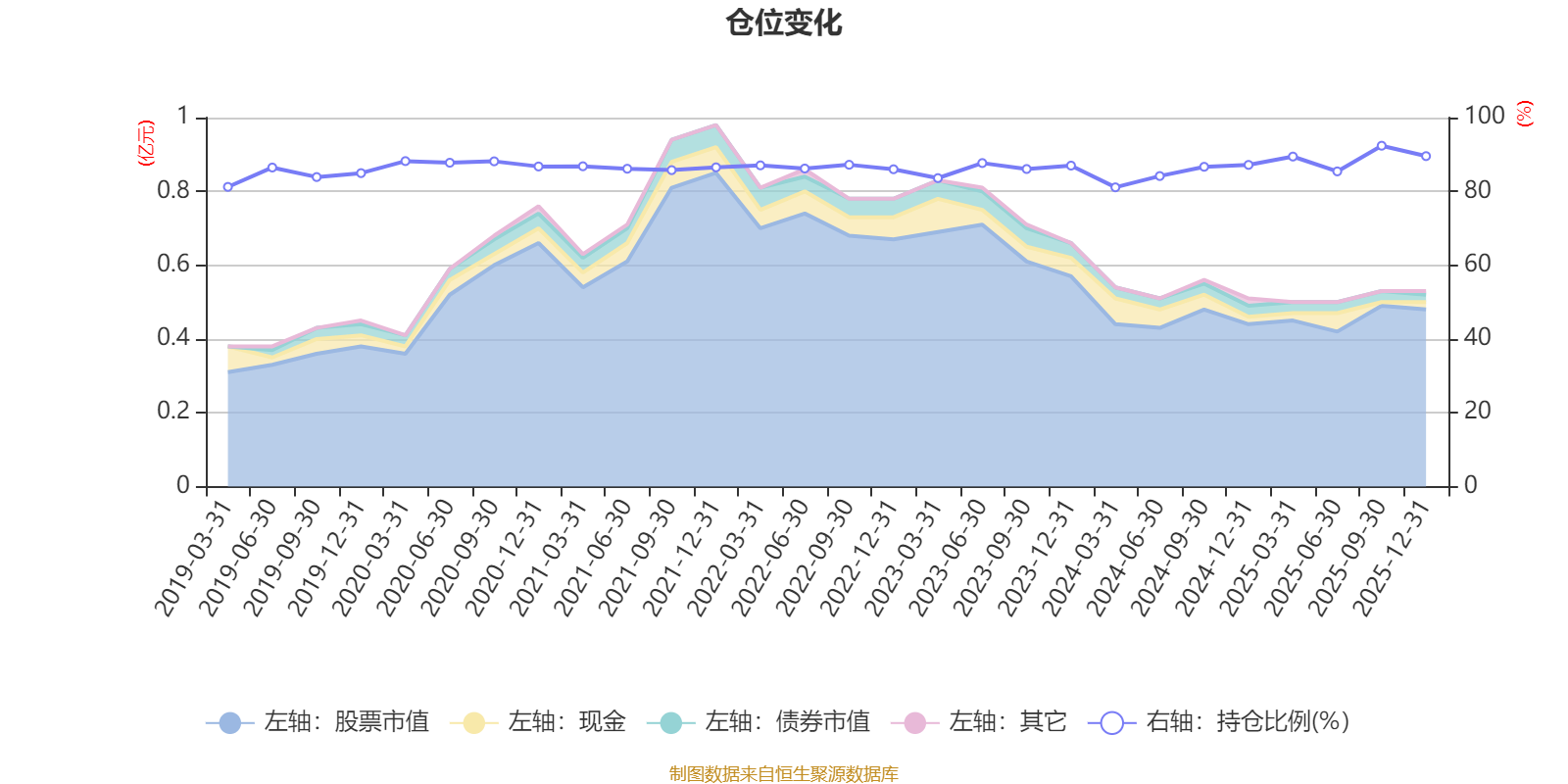 据定期报告数据统计,近三年平均股票仓位为86.69%,同类平均为84.04%。2025年三季度末基金达到92.38%的最高仓位,2024年一季度末最低,为81.1%。