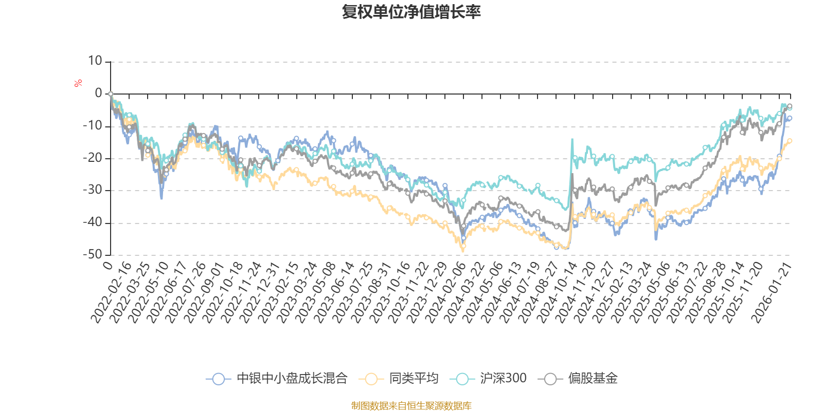 截至1月21日,中银中小盘成长混合近三个月复权单位净值增长率为27.00%,位于同类可比基金27/689;近半年复权单位净值增长率为43.63%,位于同类可比基金100/689;近一年复权单位净值增长率为53.85%,位于同类可比基金141/673;近三年复权单位净值增长率为8.90%,位于同类可比基金234/396。