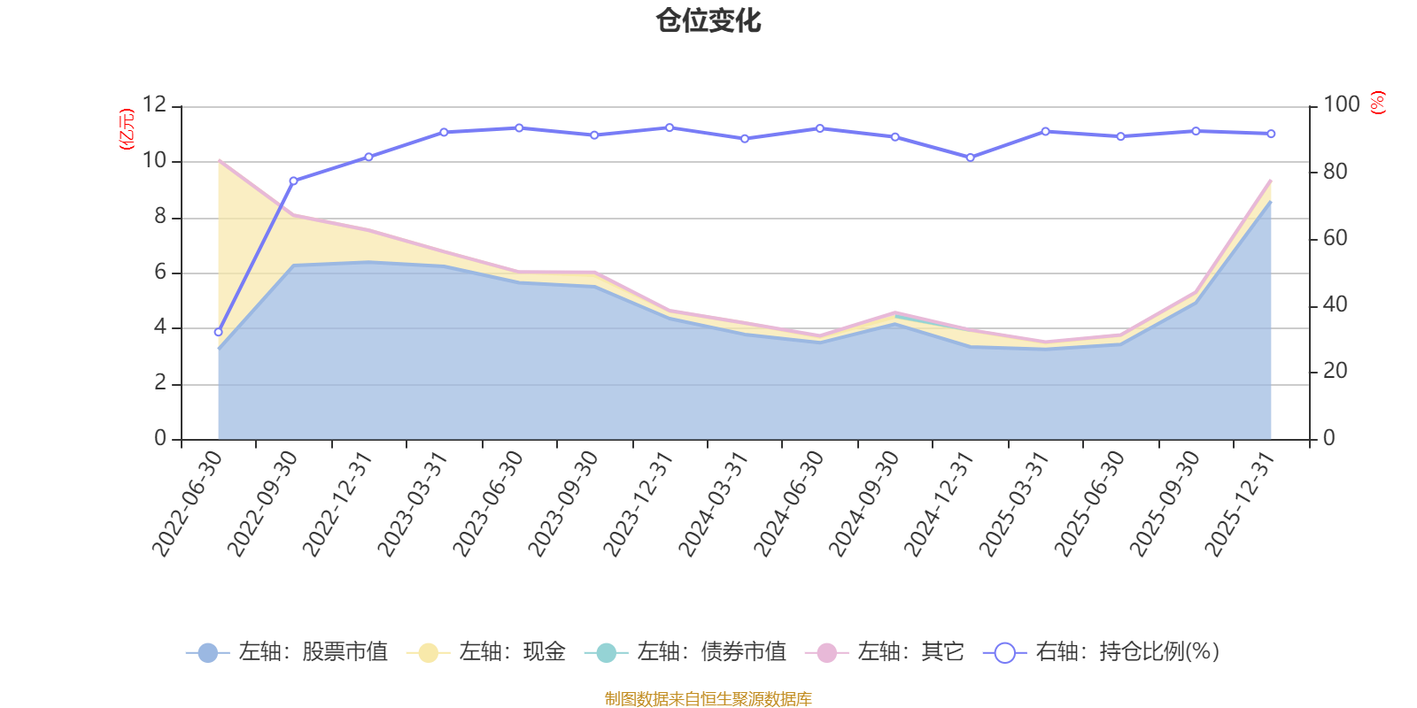 据定期报告数据统计,近三年平均股票仓位为91.43%,同类平均为85.83%。2023年末基金达到93.59%的最高仓位,2022年上半年末最低,为32.22%。