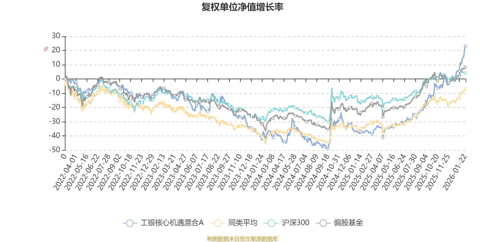 截至1月22日,工银核心机遇混合A近三个月复权单位净值增长率为31.80%,位于同类可比基金3/621;近半年复权单位净值增长率为62.91%,位于同类可比基金27/621;近一年复权单位净值增长率为97.58%,位于同类可比基金15/613;近三年复权单位净值增长率为32.91%,位于同类可比基金153/535。