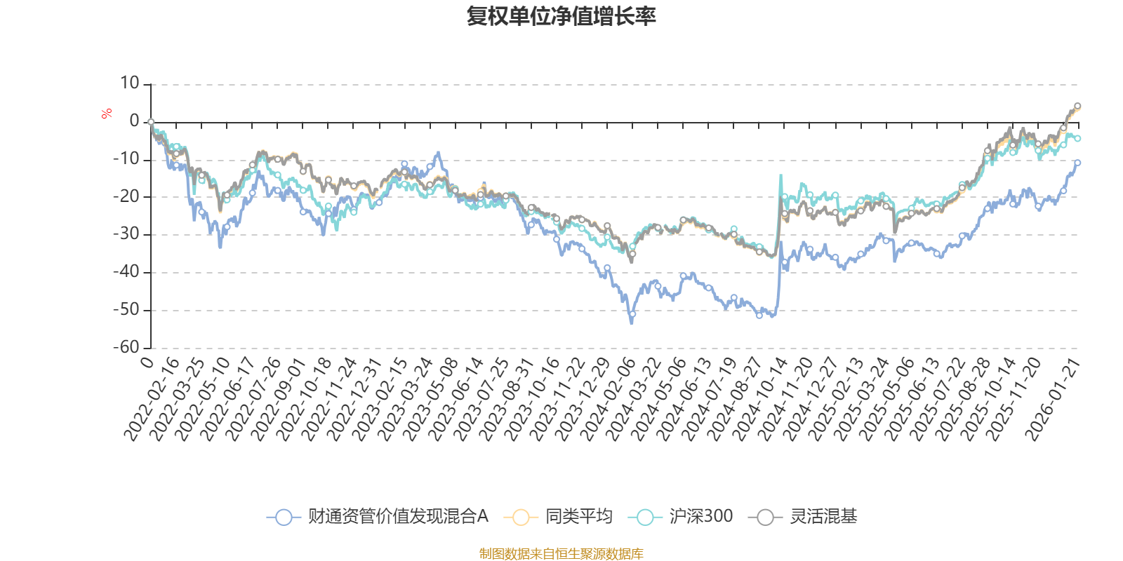 截至1月21日,财通资管价值发现混合A近三个月复权单位净值增长率为13.35%,位于同类可比基金320/1286;近半年复权单位净值增长率为30.17%,位于同类可比基金443/1286;近一年复权单位净值增长率为39.21%,位于同类可比基金505/1286;近三年复权单位净值增长率为5.81%,位于同类可比基金899/1286。