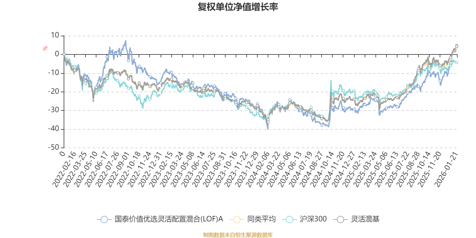截至1月21日,国泰价值优选灵活配置混合(LOF)A近三个月复权单位净值增长率为17.24%,位于同类可比基金173/1286;近半年复权单位净值增长率为33.36%,位于同类可比基金372/1286;近一年复权单位净值增长率为44.96%,位于同类可比基金388/1286;近三年复权单位净值增长率为13.68%,位于同类可比基金700/1286。