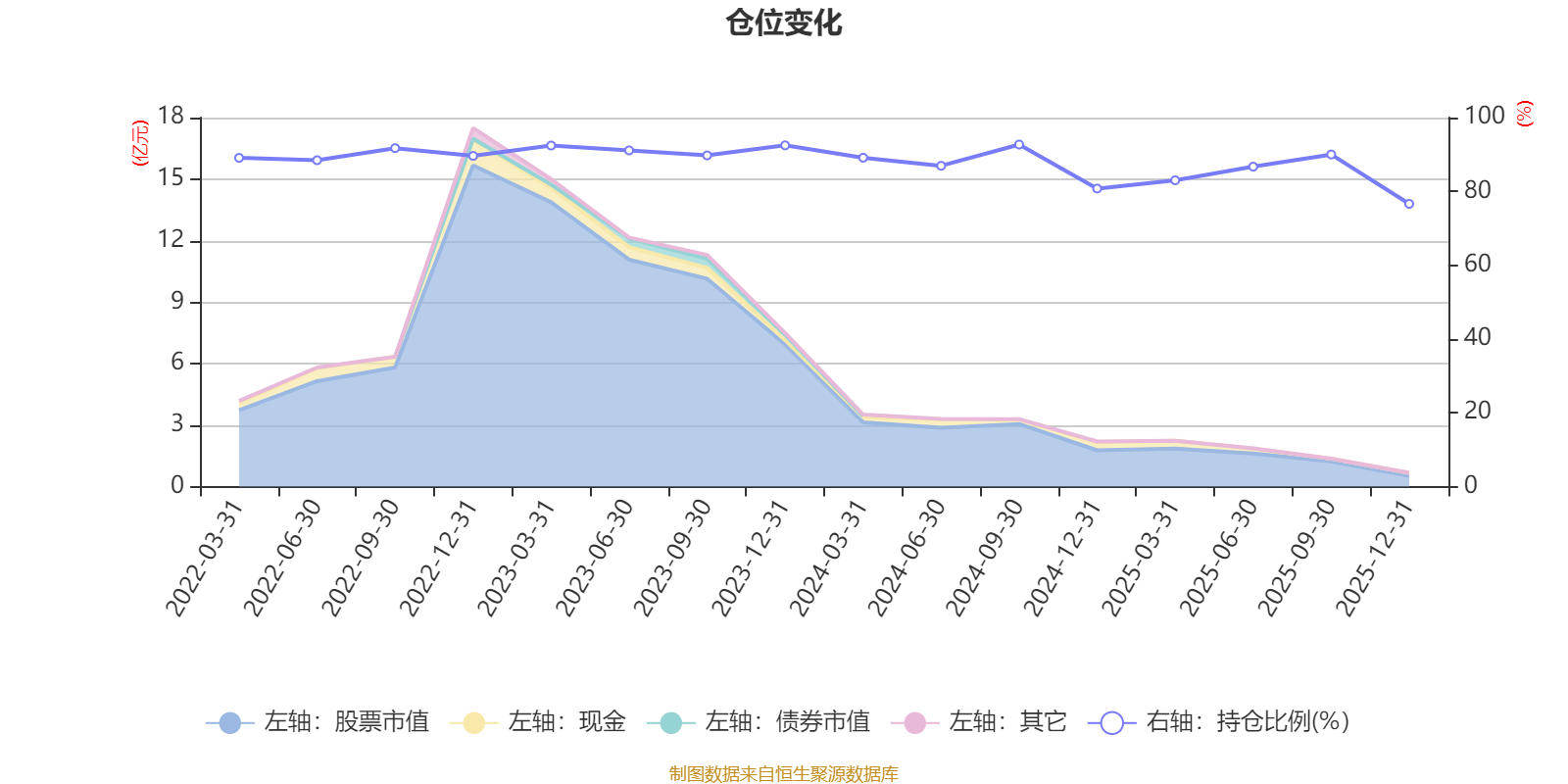 据定期报告数据统计,近三年平均股票仓位为87.64%,同类平均为72.57%。2024年三季度末基金达到92.7%的最高仓位,2025年末最低,为76.62%。