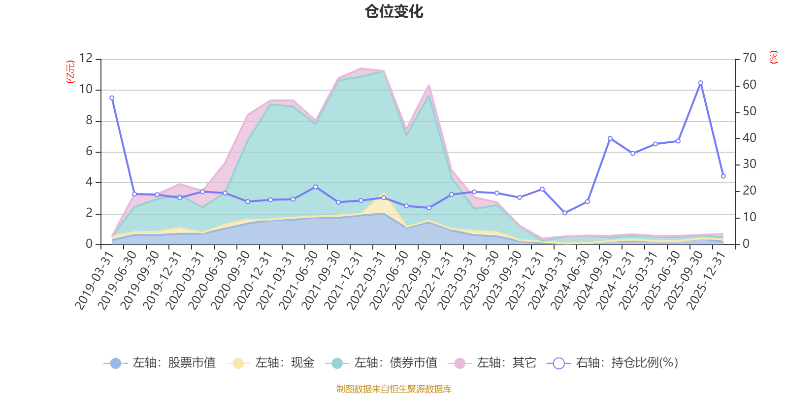 据定期报告数据统计,近三年平均股票仓位为28.71%,同类平均为72.57%。2025年三季度末基金达到61.06%的最高仓位,2024年一季度末最低,为11.92%。