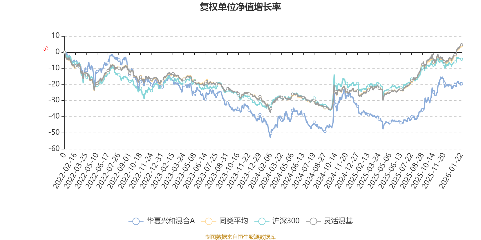 截至1月22日,华夏兴和混合A近三个月复权单位净值增长率为10.48%,位于同类可比基金545/1286;近半年复权单位净值增长率为34.15%,位于同类可比基金361/1286;近一年复权单位净值增长率为28.42%,位于同类可比基金737/1286;近三年复权单位净值增长率为-3.44%,位于同类可比基金1061/1286。