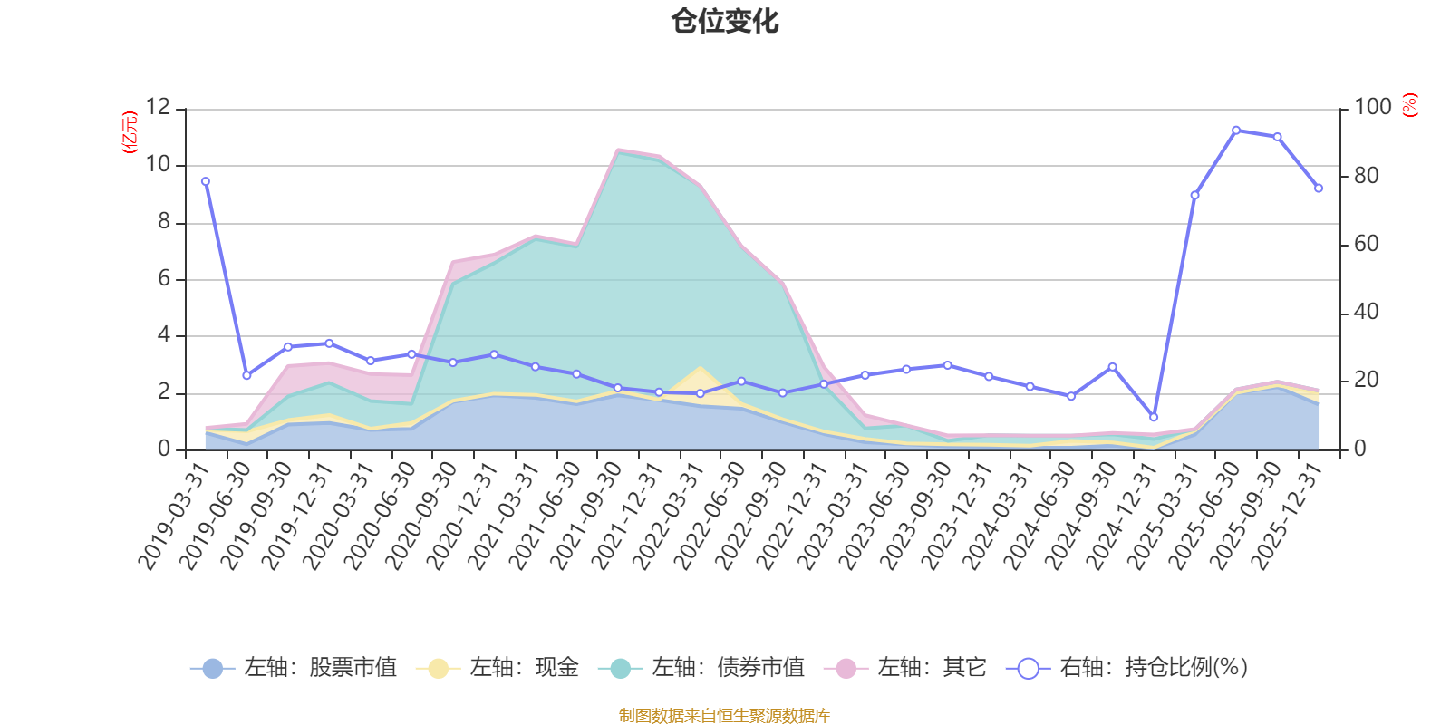 据定期报告数据统计,近三年平均股票仓位为41.43%,同类平均为72.57%。2025年上半年末基金达到93.71%的最高仓位,2024年末最低,为9.62%。