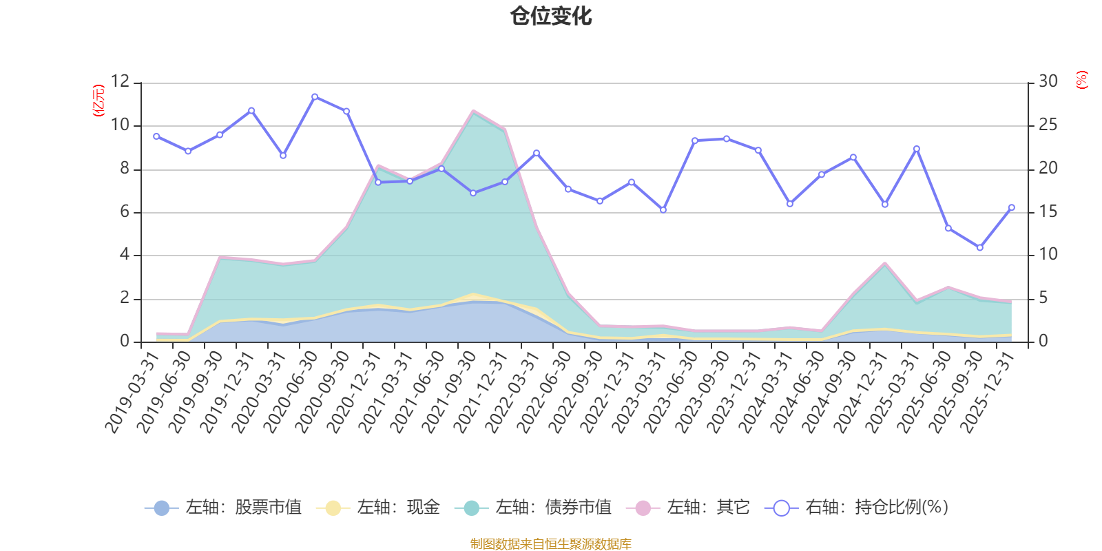 据定期报告数据统计,近三年平均股票仓位为18.24%,同类平均为19.2%。2020年上半年末基金达到28.37%的最高仓位,2025年三季度末最低,为10.92%。
