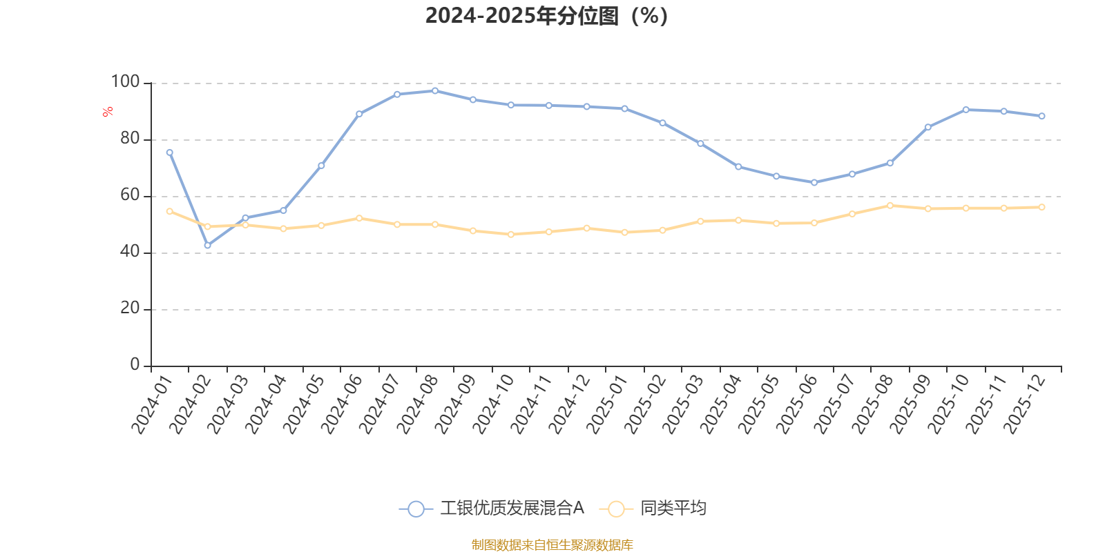 通过所选区间该基金净值增长率分位图,可以观察该基金与同类基金业绩比较情况。图为坐标原点到区间内某时点的净值增长率在同类基金中的分位数。