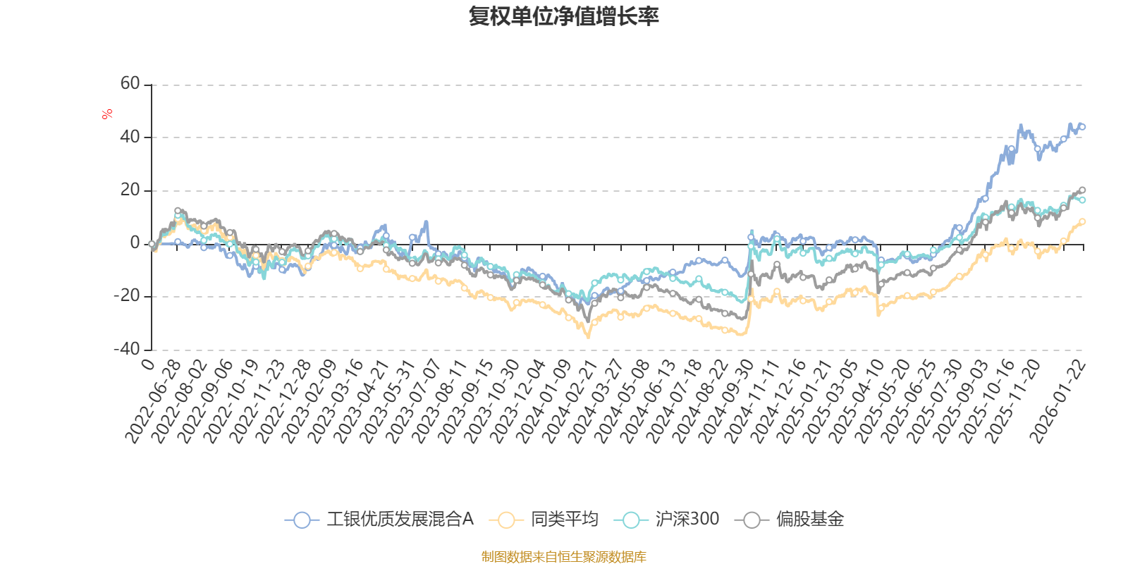 截至1月22日,工银优质发展混合A近三个月复权单位净值增长率为7.28%,位于同类可比基金423/689;近半年复权单位净值增长率为36.38%,位于同类可比基金164/689;近一年复权单位净值增长率为47.78%,位于同类可比基金225/673;近三年复权单位净值增长率为44.40%,位于同类可比基金56/396。