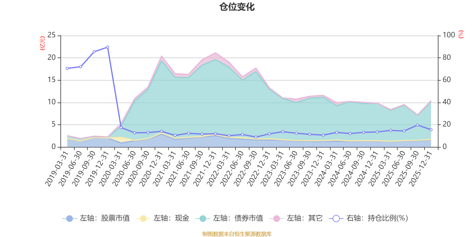 据定期报告数据统计,近三年平均股票仓位为13.78%,同类平均为72.57%。2019年末基金达到89.61%的最高仓位,2022年三季度末最低,为9.01%。