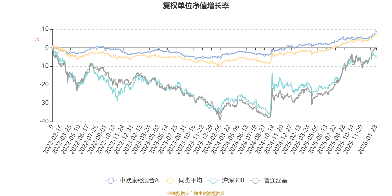 截至1月23日,中欧康裕混合A近三个月复权单位净值增长率为3.50%,位于同类可比基金165/629;近半年复权单位净值增长率为4.61%,位于同类可比基金301/629;近一年复权单位净值增长率为7.92%,位于同类可比基金321/626;近三年复权单位净值增长率为11.49%,位于同类可比基金301/564。