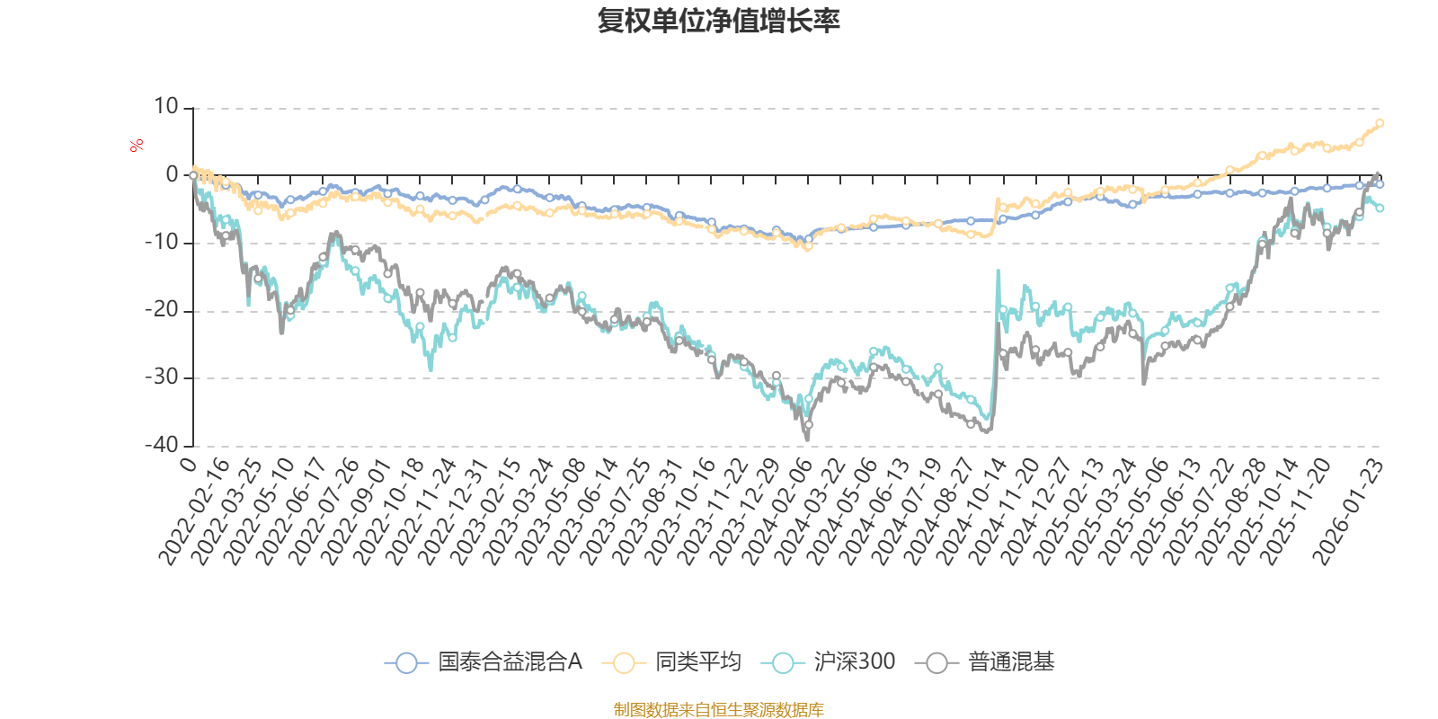 截至1月23日,国泰合益混合A近三个月复权单位净值增长率为0.96%,位于同类可比基金524/683;近半年复权单位净值增长率为1.40%,位于同类可比基金580/683;近一年复权单位净值增长率为2.17%,位于同类可比基金629/683;近三年复权单位净值增长率为0.47%,位于同类可比基金566/617。