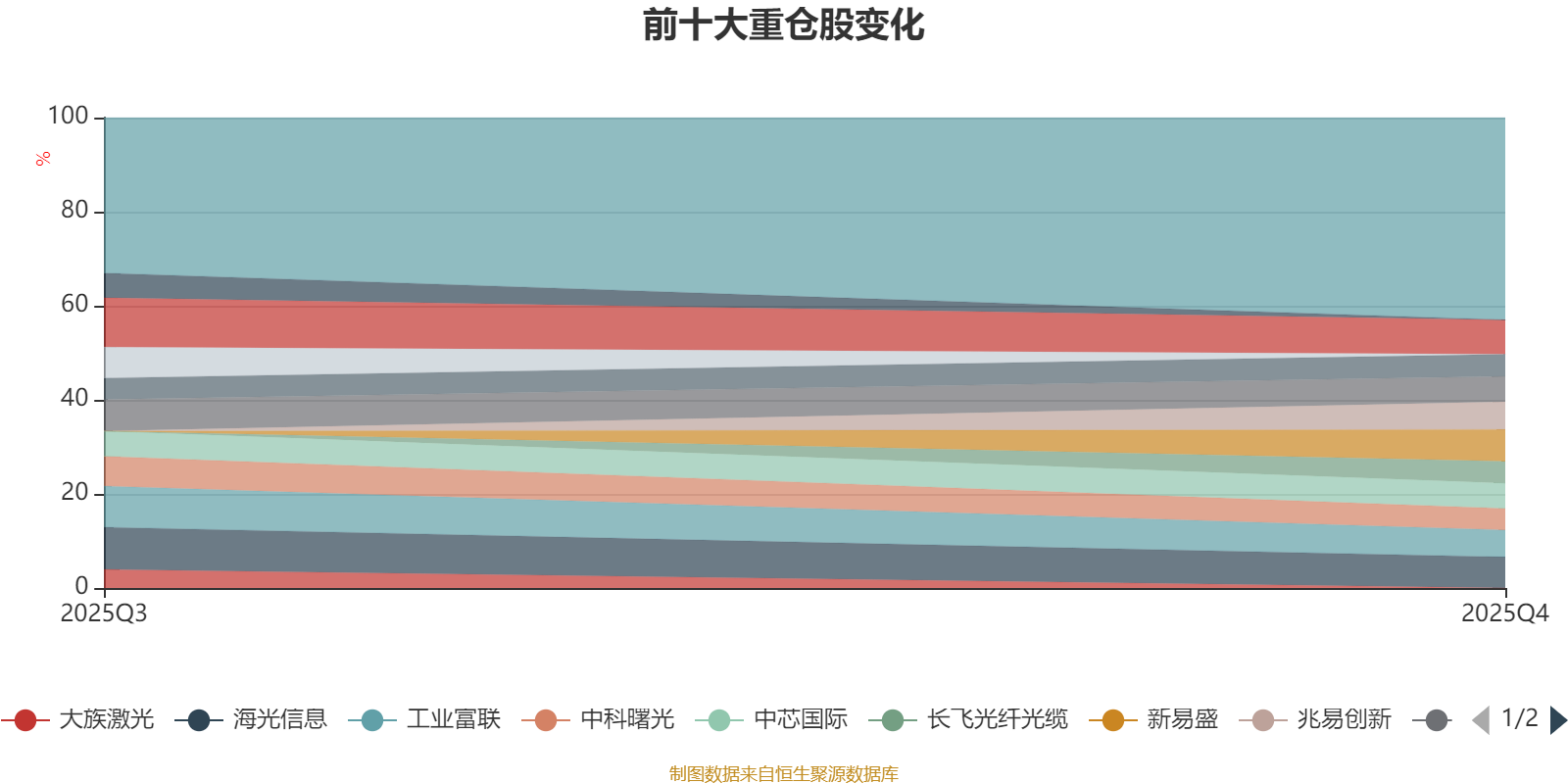 该基金持股集中度较高。截至2025年四季度末,基金十大重仓股分别是中际旭创、新易盛、海光信息、兆易创新、工业富联、寒武纪、中芯国际、华虹半导体、长飞光纤光缆、中科曙光。
