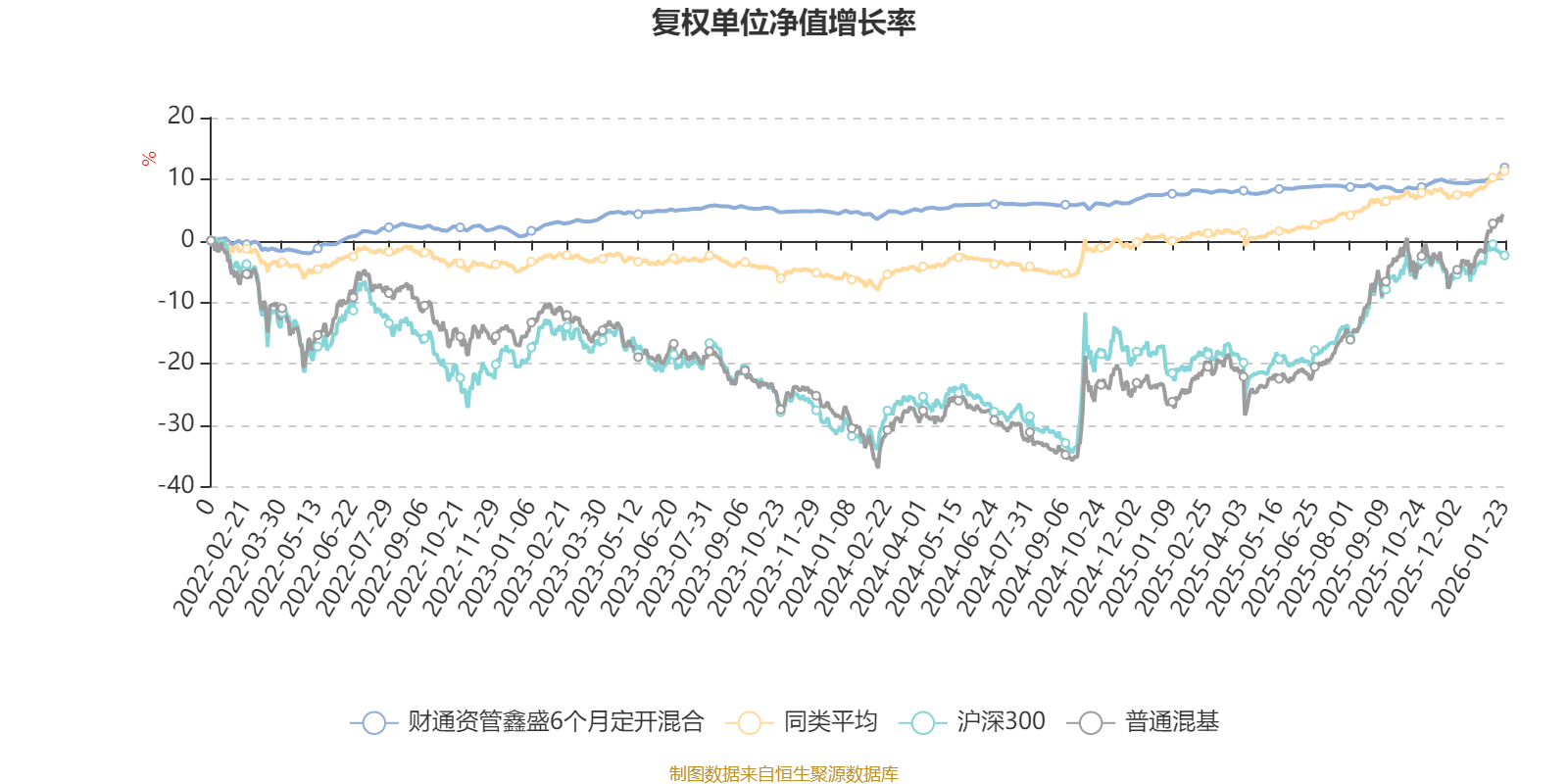 截至1月23日,财通资管鑫盛6个月定开混合近三个月复权单位净值增长率为3.16%,位于同类可比基金162/520;近半年复权单位净值增长率为2.77%,位于同类可比基金351/520;近一年复权单位净值增长率为4.11%,位于同类可比基金404/520;近三年复权单位净值增长率为9.13%,位于同类可比基金322/519。
