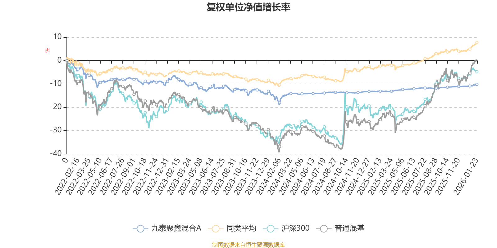 截至1月23日,九泰聚鑫混合A近三个月复权单位净值增长率为1.30%,位于同类可比基金474/683;近半年复权单位净值增长率为1.81%,位于同类可比基金556/683;近一年复权单位净值增长率为3.50%,位于同类可比基金570/683;近三年复权单位净值增长率为-3.89%,位于同类可比基金597/617。