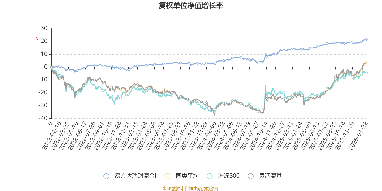 截至1月22日,易方达瑞财混合I近三个月复权单位净值增长率为2.54%,位于同类可比基金1001/1286;近半年复权单位净值增长率为2.63%,位于同类可比基金1148/1286;近一年复权单位净值增长率为7.00%,位于同类可比基金1155/1286;近三年复权单位净值增长率为20.98%,位于同类可比基金535/1286。