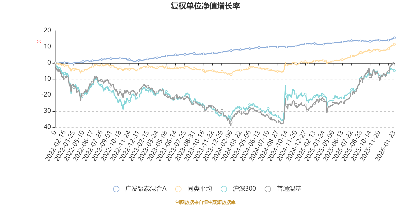 截至1月23日,广发聚泰混合A近三个月复权单位净值增长率为1.75%,位于同类可比基金237/388;近半年复权单位净值增长率为1.58%,位于同类可比基金315/388;近一年复权单位净值增长率为3.42%,位于同类可比基金327/388;近三年复权单位净值增长率为13.63%,位于同类可比基金141/387。