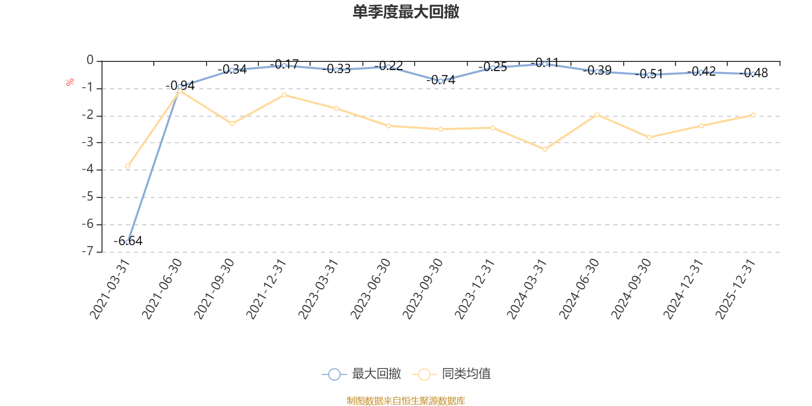 截至1月23日,基金近三年最大回撤为0.93%,同类可比基金排名2/353。单季度最大回撤出现在2021年一季度,为6.64%。
