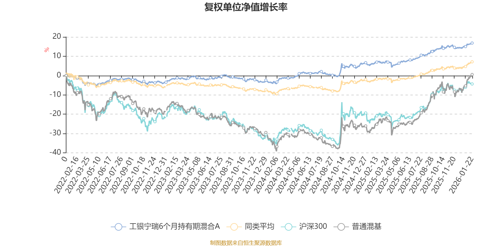 截至1月22日,工银宁瑞6个月持有期混合A近三个月复权单位净值增长率为2.22%,位于同类可比基金306/629;近半年复权单位净值增长率为5.68%,位于同类可比基金225/629;近一年复权单位净值增长率为10.22%,位于同类可比基金207/626;近三年复权单位净值增长率为18.90%,位于同类可比基金101/564。