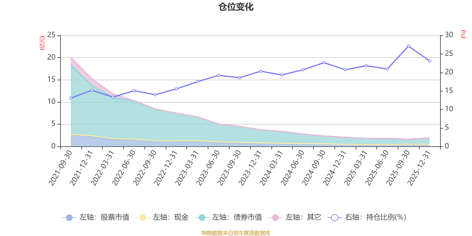 据定期报告数据统计,近三年平均股票仓位为21%,同类平均为19.2%。2025年三季度末基金达到27.11%的最高仓位,2021年三季度末最低,为13.06%。