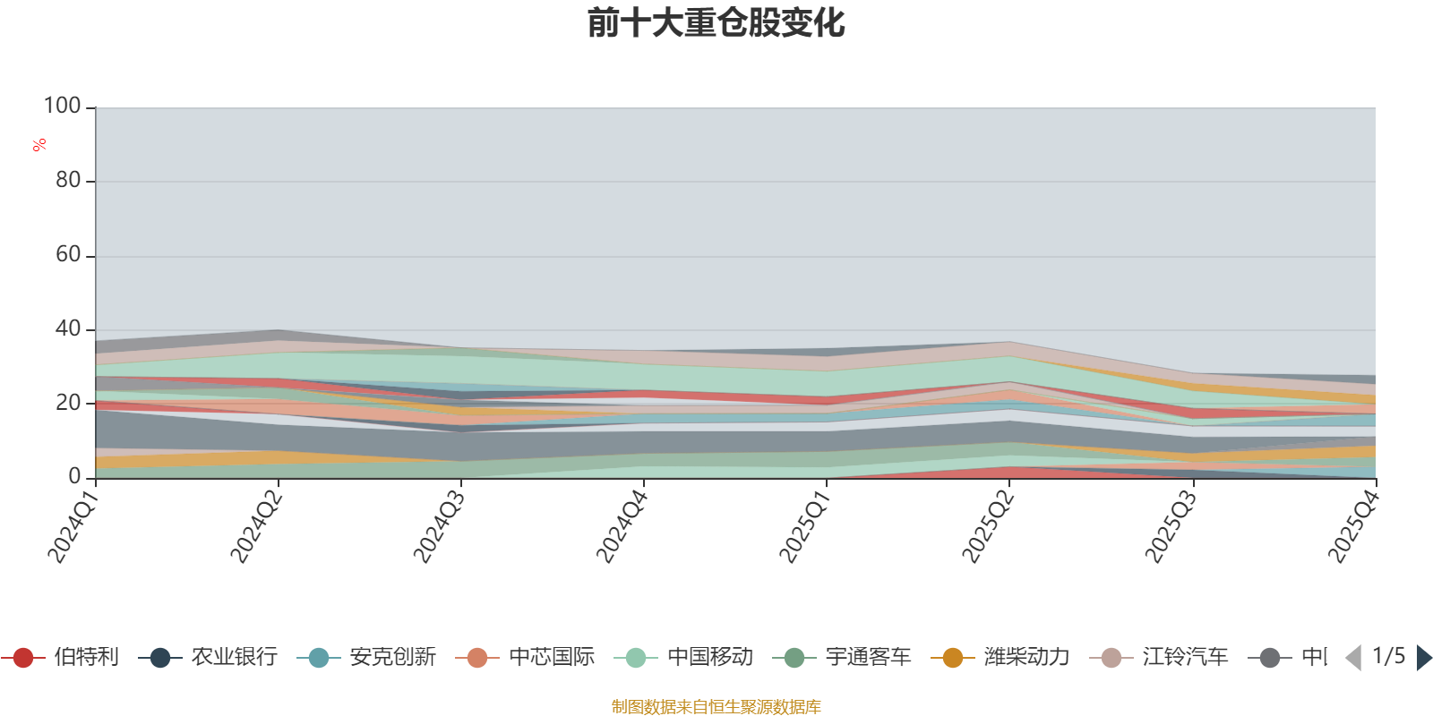 截至2025年四季度末,基金十大重仓股分别是中国银行、潍柴动力、安克创新、长江电力、工商银行、宇通客车、紫金矿业、中国铝业、宁德时代、银轮股份。