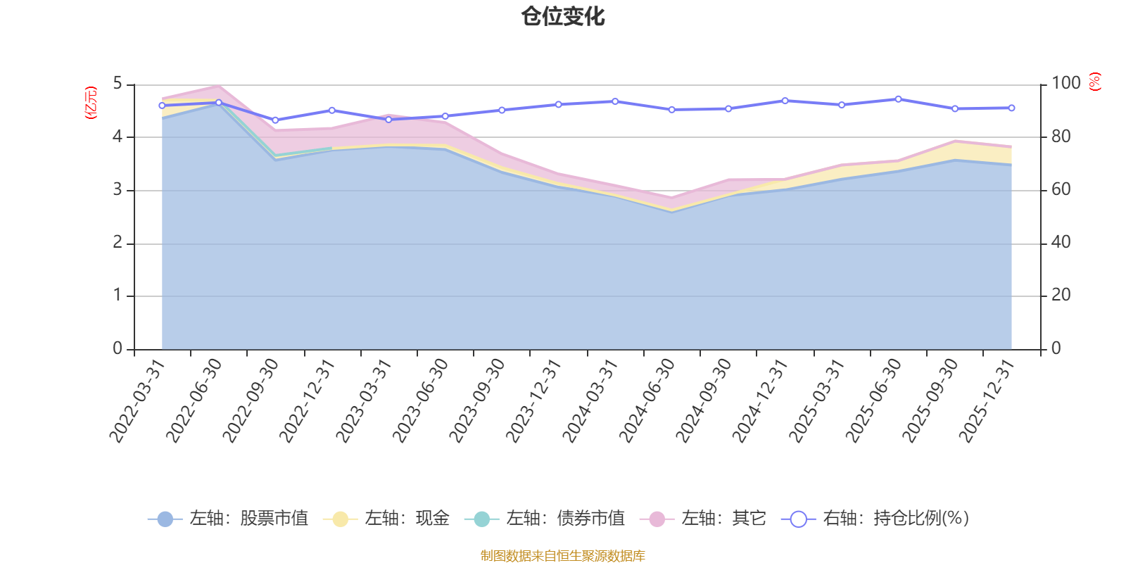 据定期报告数据统计,近三年平均股票仓位为91.26%,同类平均为85.83%。2025年上半年末基金达到94.48%的最高仓位,2022年三季度末最低,为86.52%。