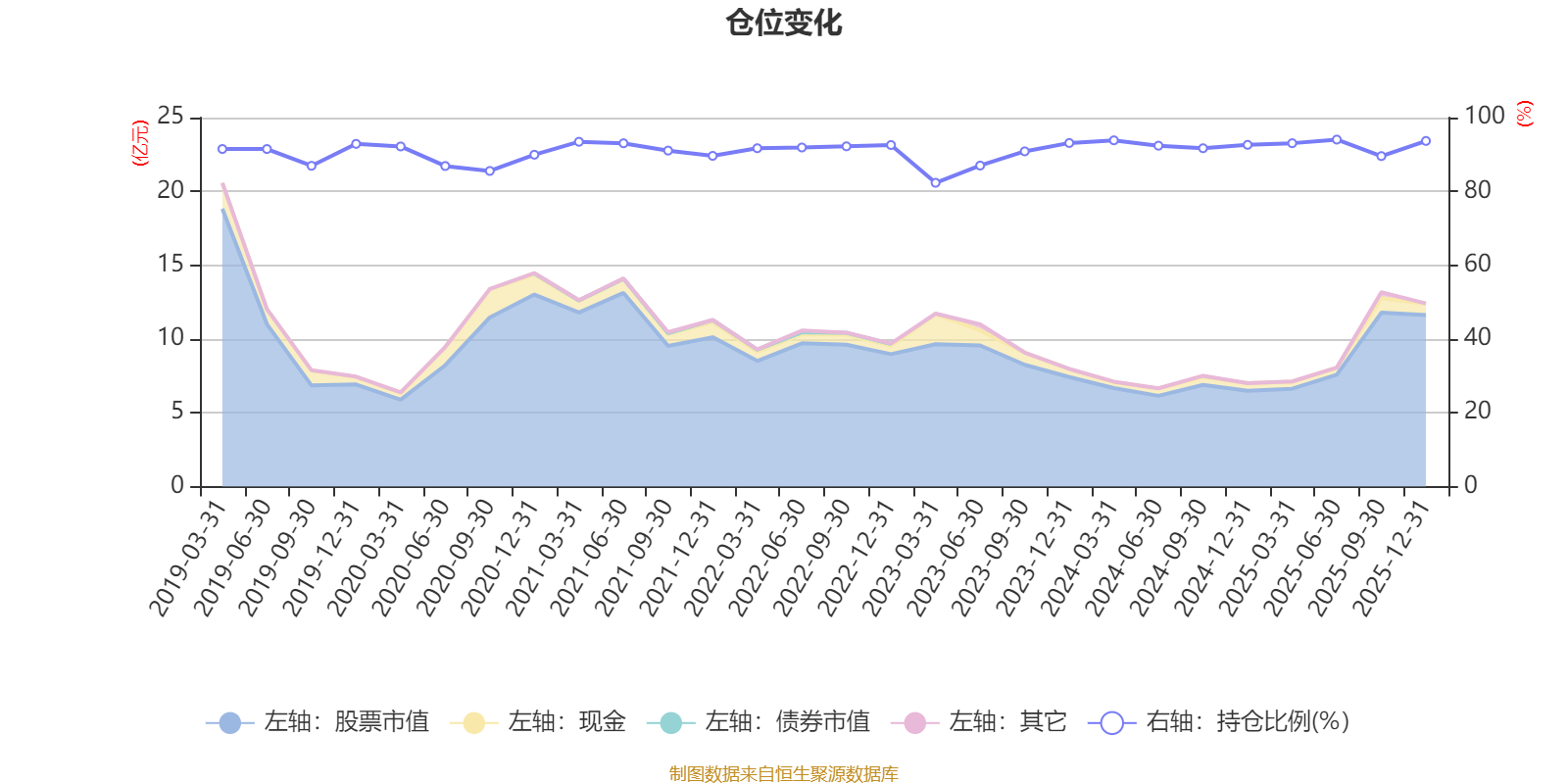 据定期报告数据统计,近三年平均股票仓位为91.18%,同类平均为86.12%。2025年上半年末基金达到94.04%的最高仓位,2023年一季度末最低,为82.33%。