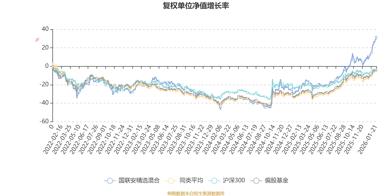 截至1月21日,国联安精选混合近三个月复权单位净值增长率为25.34%,位于同类可比基金5/265;近半年复权单位净值增长率为54.93%,位于同类可比基金14/265;近一年复权单位净值增长率为79.22%,位于同类可比基金10/265;近三年复权单位净值增长率为65.39%,位于同类可比基金13/256。