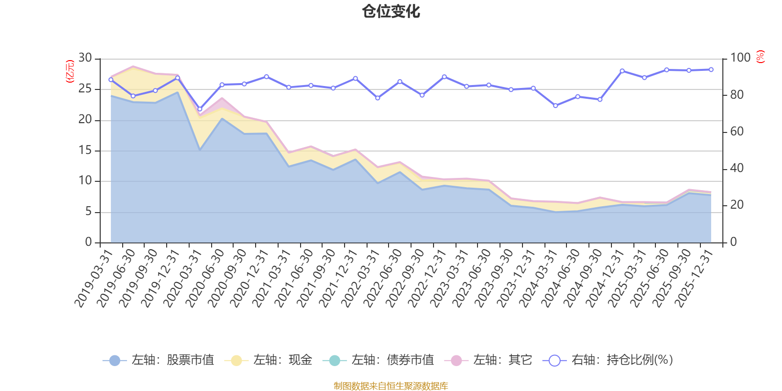 据定期报告数据统计,近三年平均股票仓位为86.17%,同类平均为86.12%。2025年末基金达到94.06%的最高仓位,2020年一季度末最低,为72.63%。