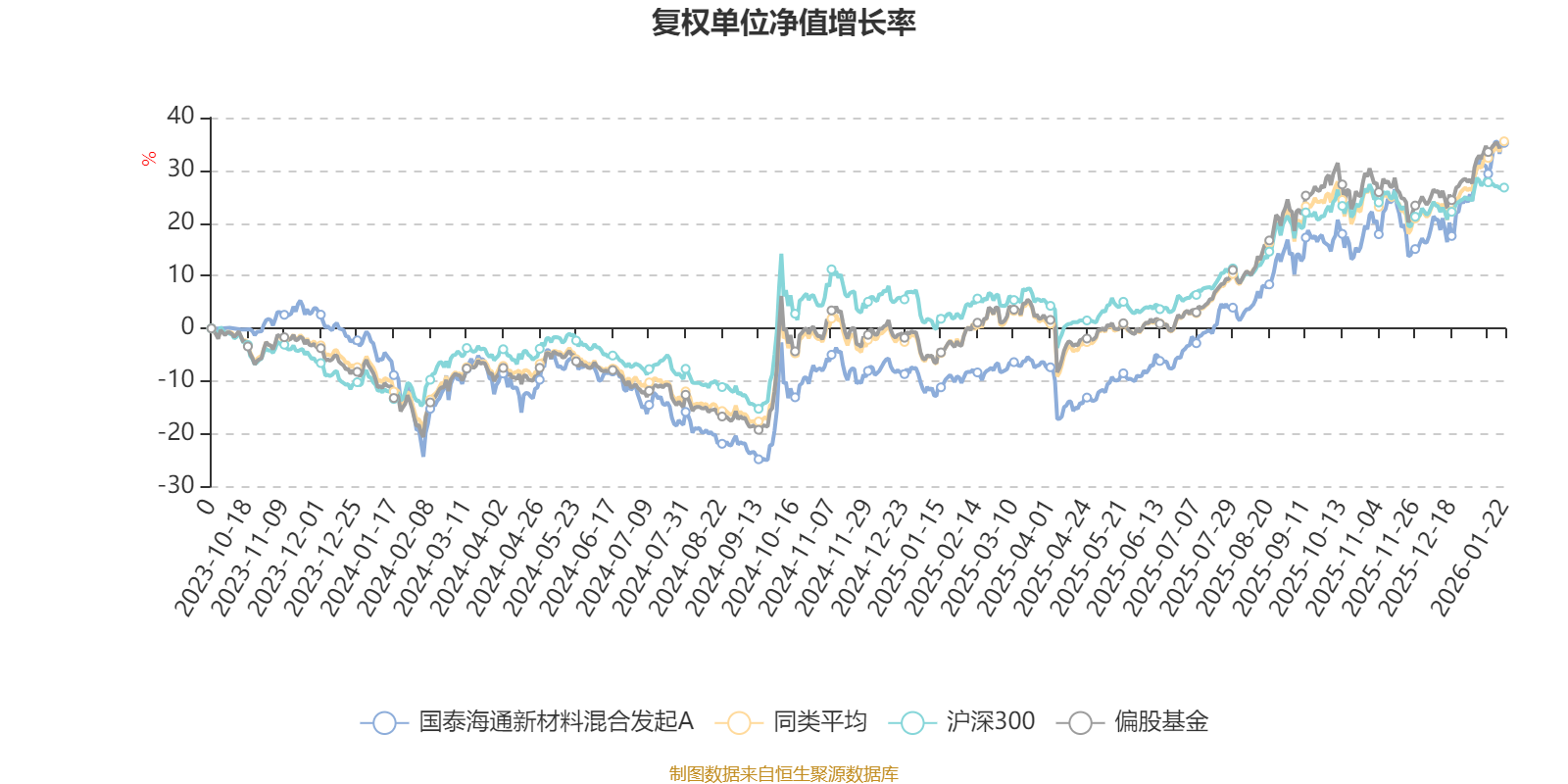 截至1月22日,国泰海通新材料混合发起A近三个月复权单位净值增长率为18.09%,位于同类可比基金111/689;近半年复权单位净值增长率为29.23%,位于同类可比基金261/689;近一年复权单位净值增长率为49.30%,位于同类可比基金208/673。