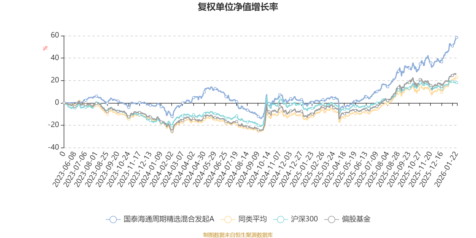 截至1月22日,国泰海通周期精选混合发起A近三个月复权单位净值增长率为22.77%,位于同类可比基金50/689;近半年复权单位净值增长率为35.55%,位于同类可比基金178/689;近一年复权单位净值增长率为57.26%,位于同类可比基金129/673。