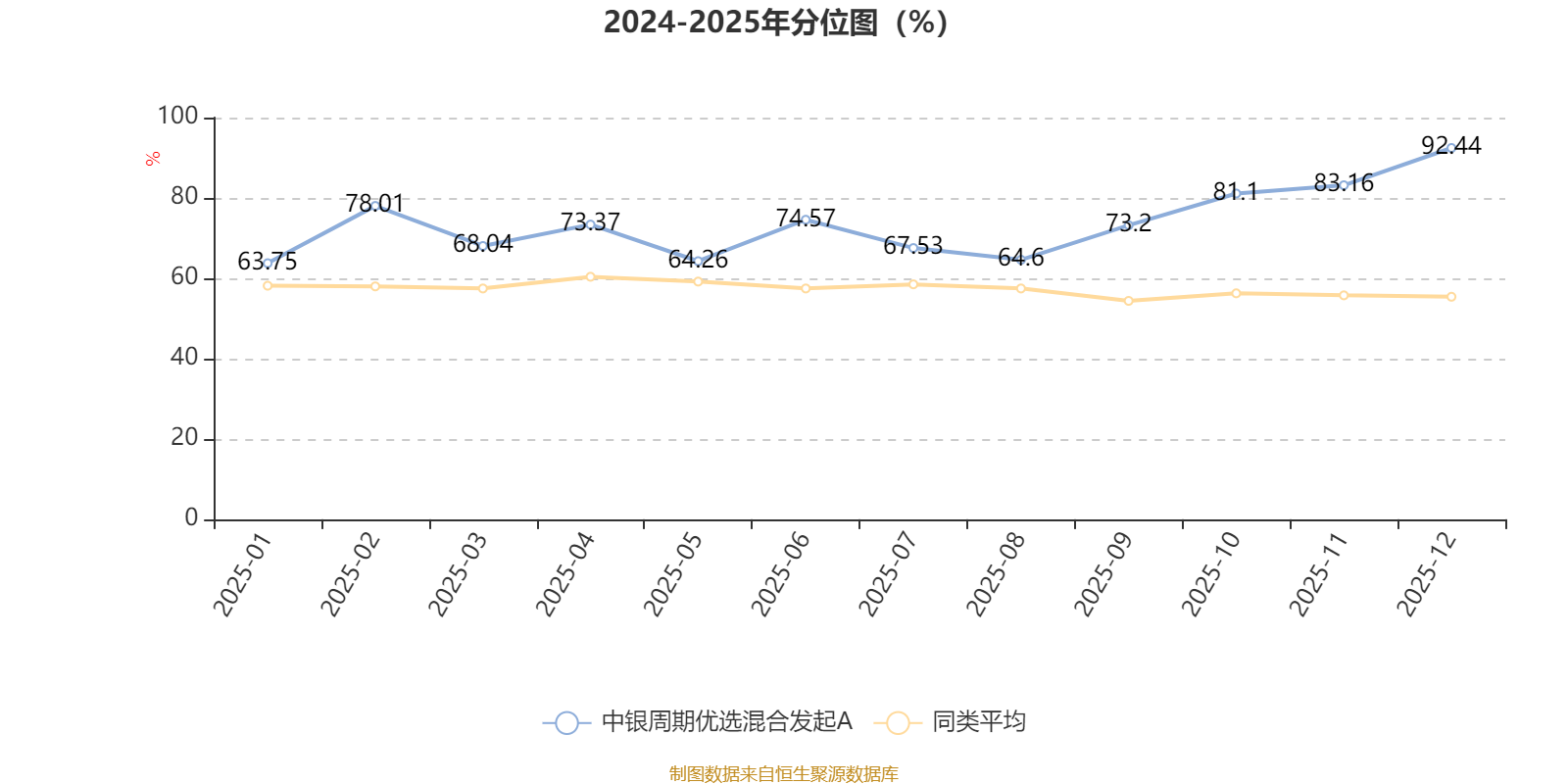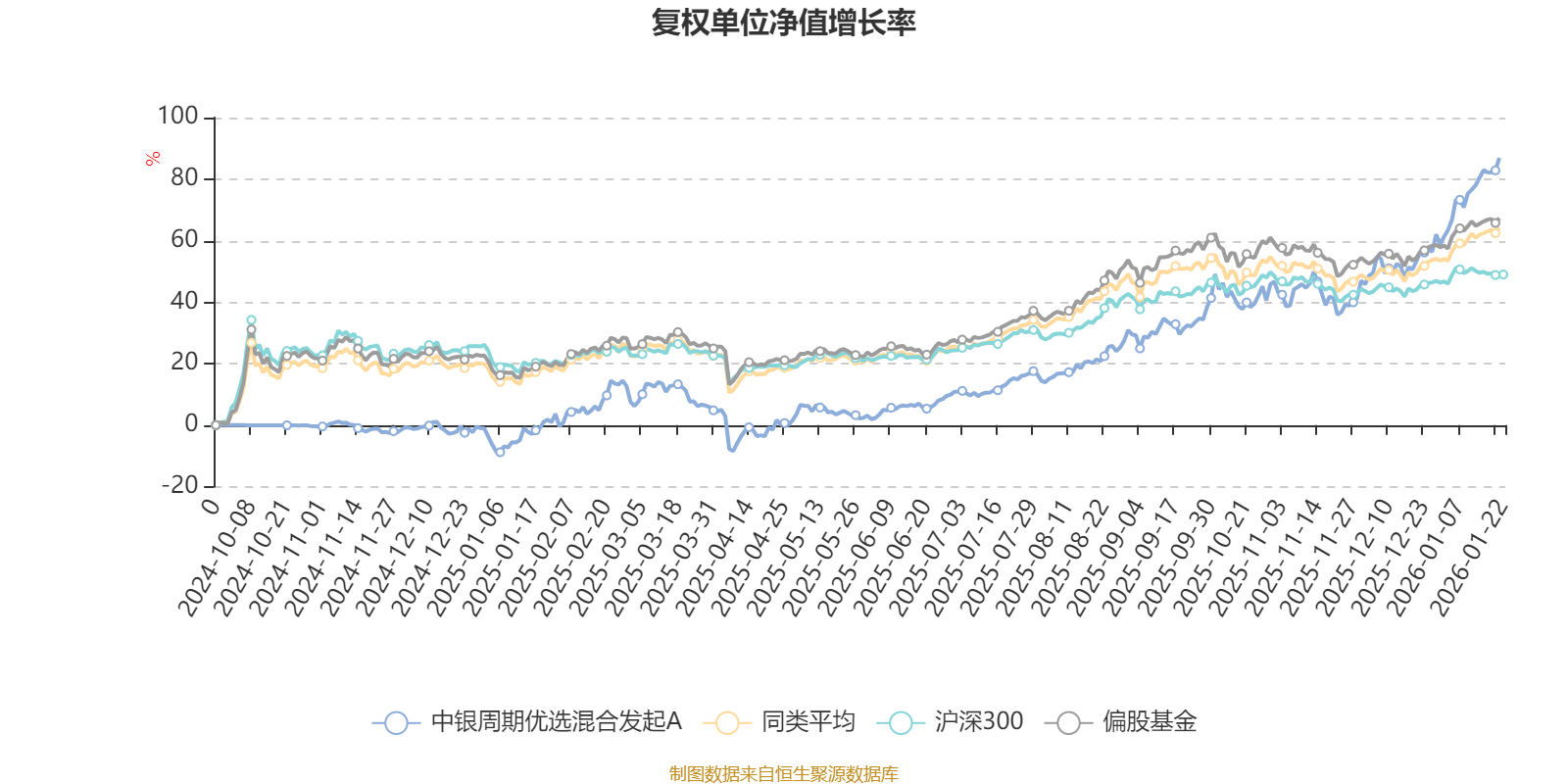 截至1月21日,中银周期优选混合发起A近三个月复权单位净值增长率为33.61%,位于同类可比基金10/689;近半年复权单位净值增长率为63.23%,位于同类可比基金24/689;近一年复权单位净值增长率为85.00%,位于同类可比基金27/673。