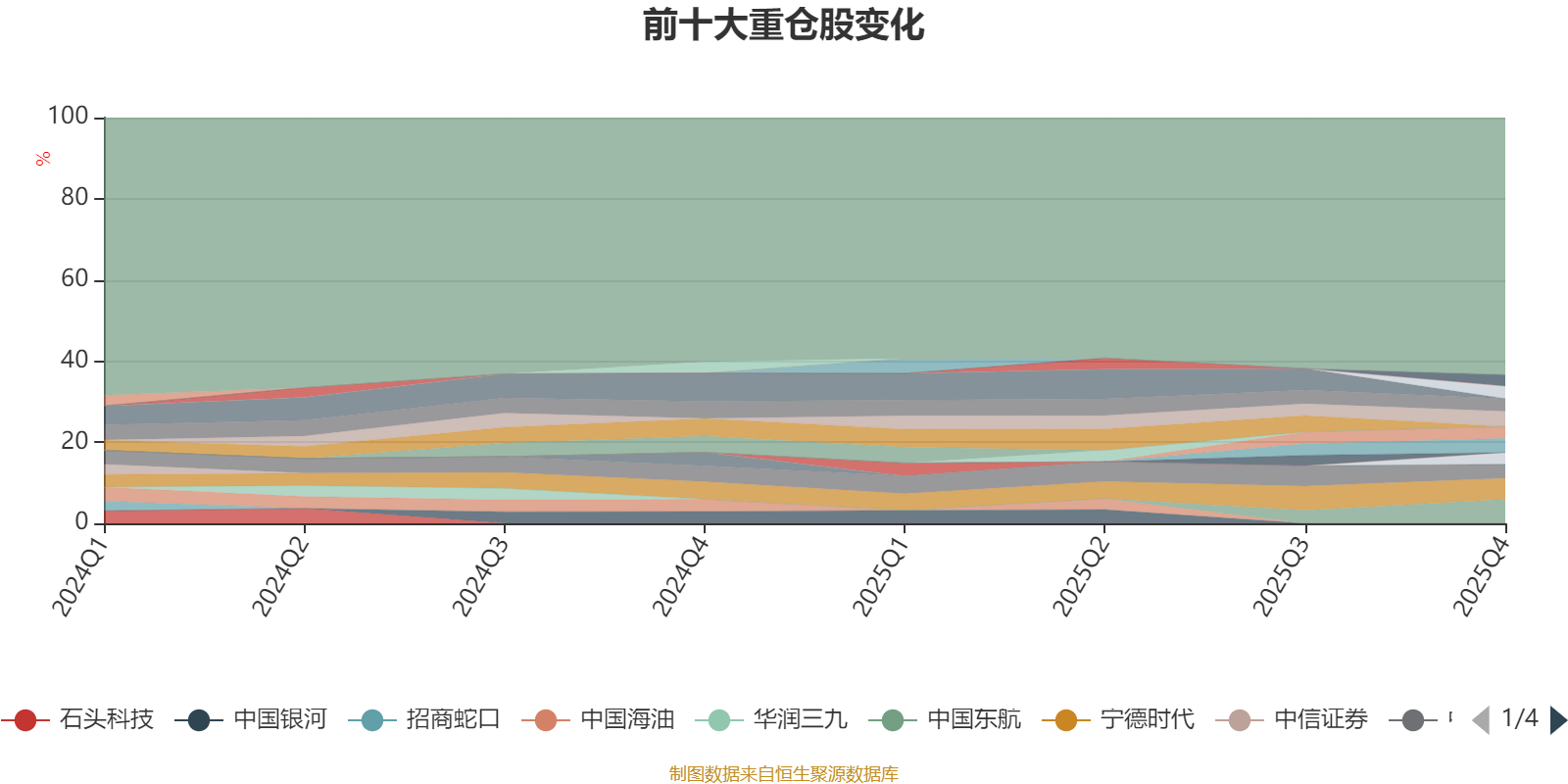 截至2025年四季度末,基金十大重仓股分别是中国东航、宁德时代、山金国际、山东黄金、中国建筑、中国移动、瀚蓝环境、紫金矿业、藏格矿业、中国巨石。