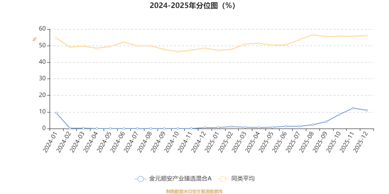 通过所选区间该基金净值增长率分位图,可以观察该基金与同类基金业绩比较情况。图为坐标原点到区间内某时点的净值增长率在同类基金中的分位数。