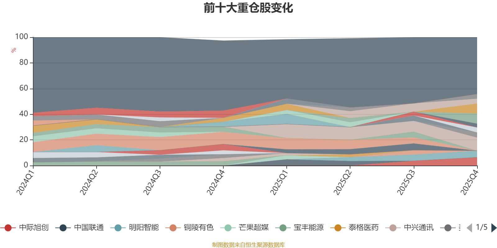 截至2025年四季度末,基金十大重仓股分别是腾讯控股、东山精密、阿里巴巴-W、中际旭创、明阳智能、新易盛、华曙高科、世纪华通、巨化股份、欣旺达。