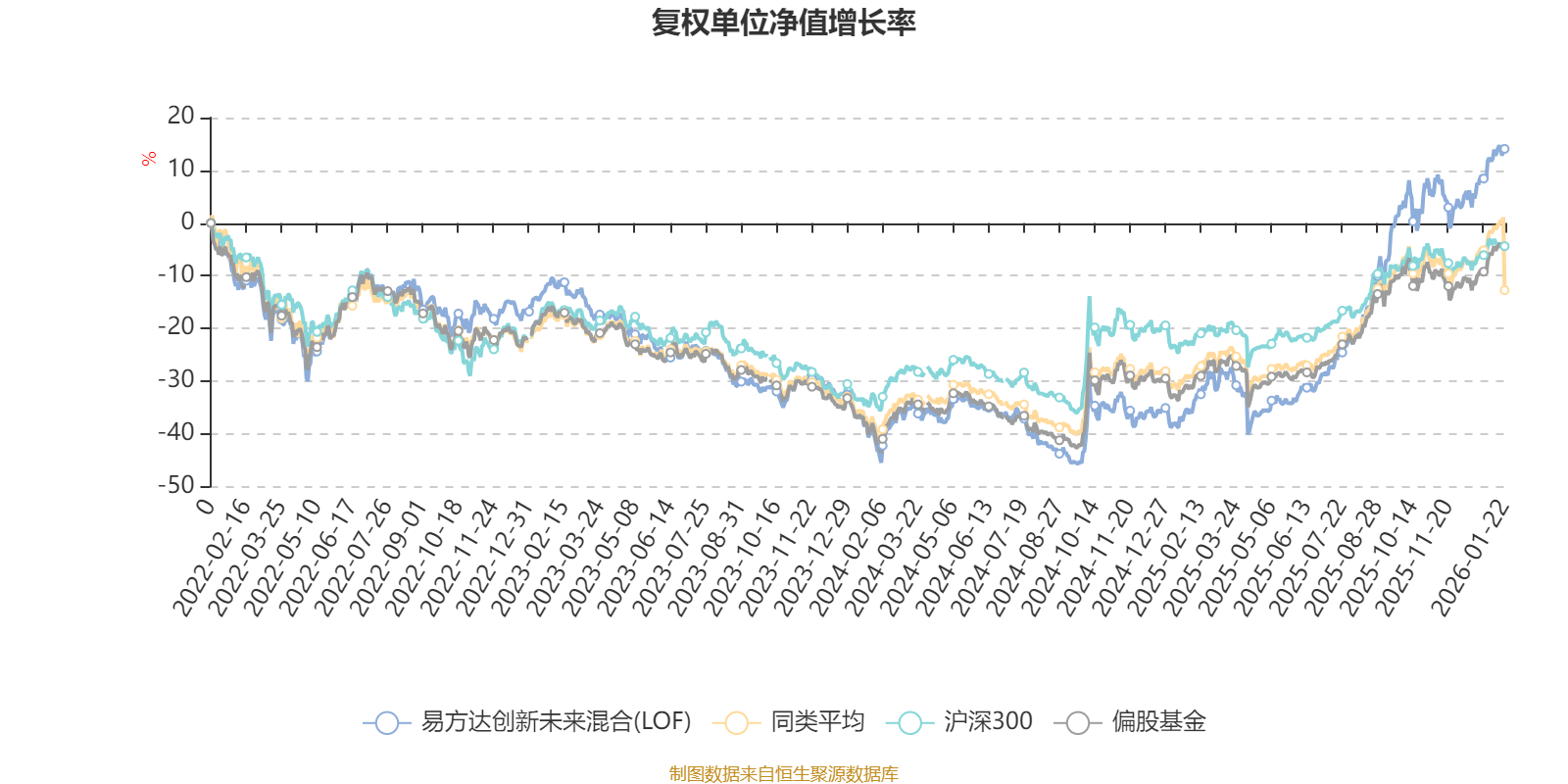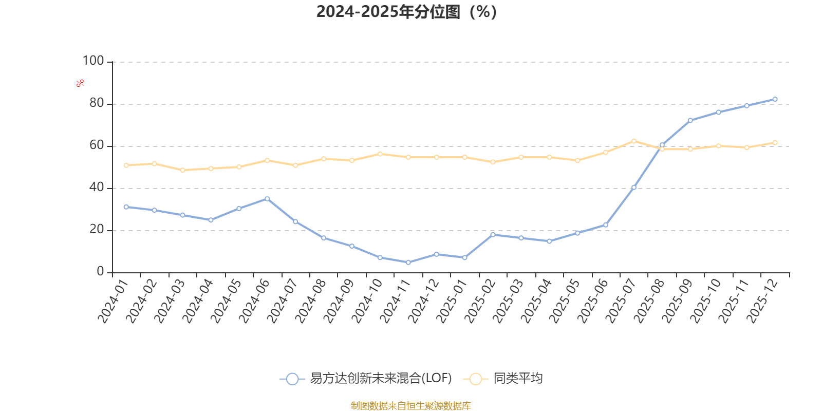 截至1月22日,易方达创新未来混合(LOF)近三个月复权单位净值增长率为11.62%,位于同类可比基金41/130;近半年复权单位净值增长率为51.20%,位于同类可比基金9/130;近一年复权单位净值增长率为76.72%,位于同类可比基金11/130;近三年复权单位净值增长率为29.16%,位于同类可比基金42/125。