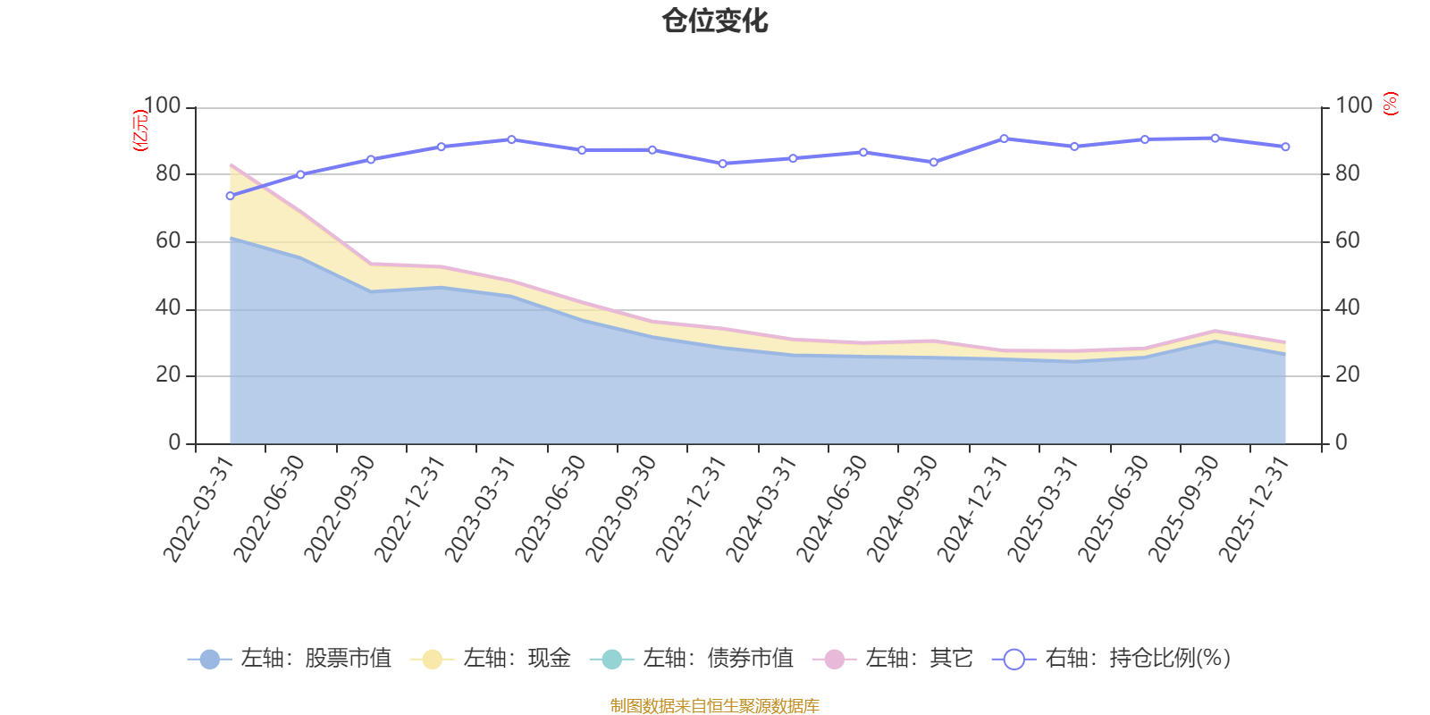 据定期报告数据统计,近三年平均股票仓位为87.65%,同类平均为86.17%。2025年三季度末基金达到90.81%的最高仓位,2022年一季度末最低,为73.67%。