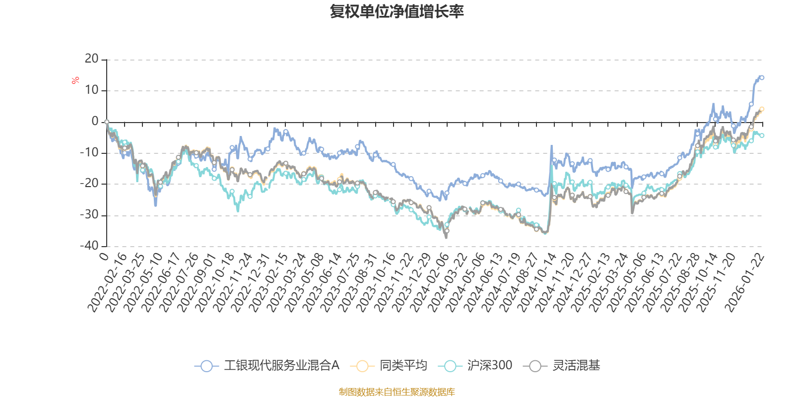 截至1月22日,工银现代服务业混合A近三个月复权单位净值增长率为13.00%,位于同类可比基金395/1286;近半年复权单位净值增长率为29.08%,位于同类可比基金456/1286;近一年复权单位净值增长率为34.74%,位于同类可比基金599/1286;近三年复权单位净值增长率为17.10%,位于同类可比基金619/1286。