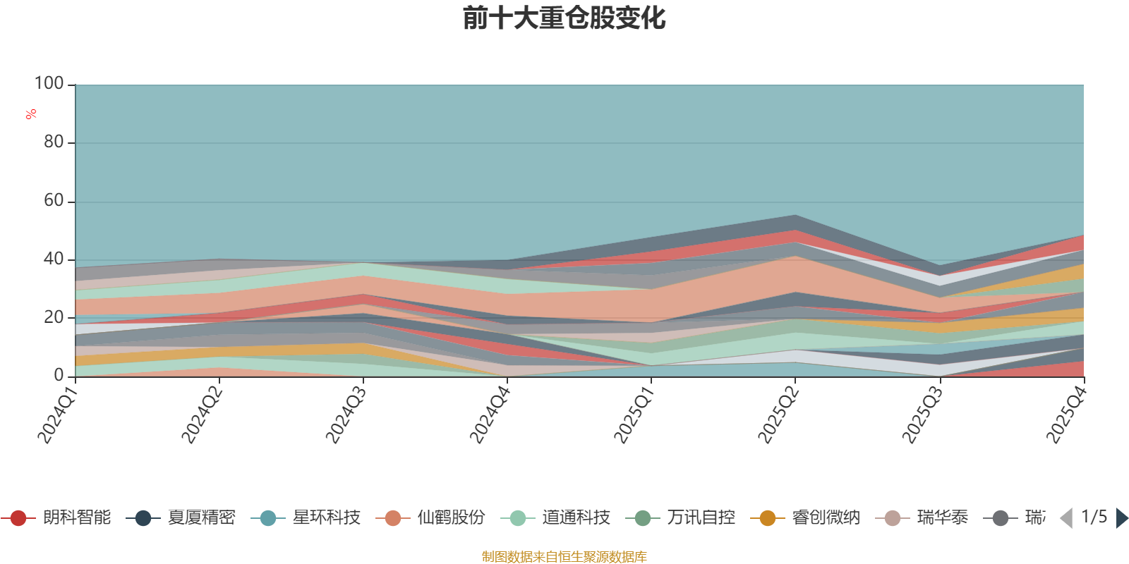 截至2025年四季度末,基金十大重仓股分别是派斯林、朗科智能、奕瑞科技、泛微网络、漫步者、芯海科技、国投智能、阿尔特、富满微、夏厦精密。