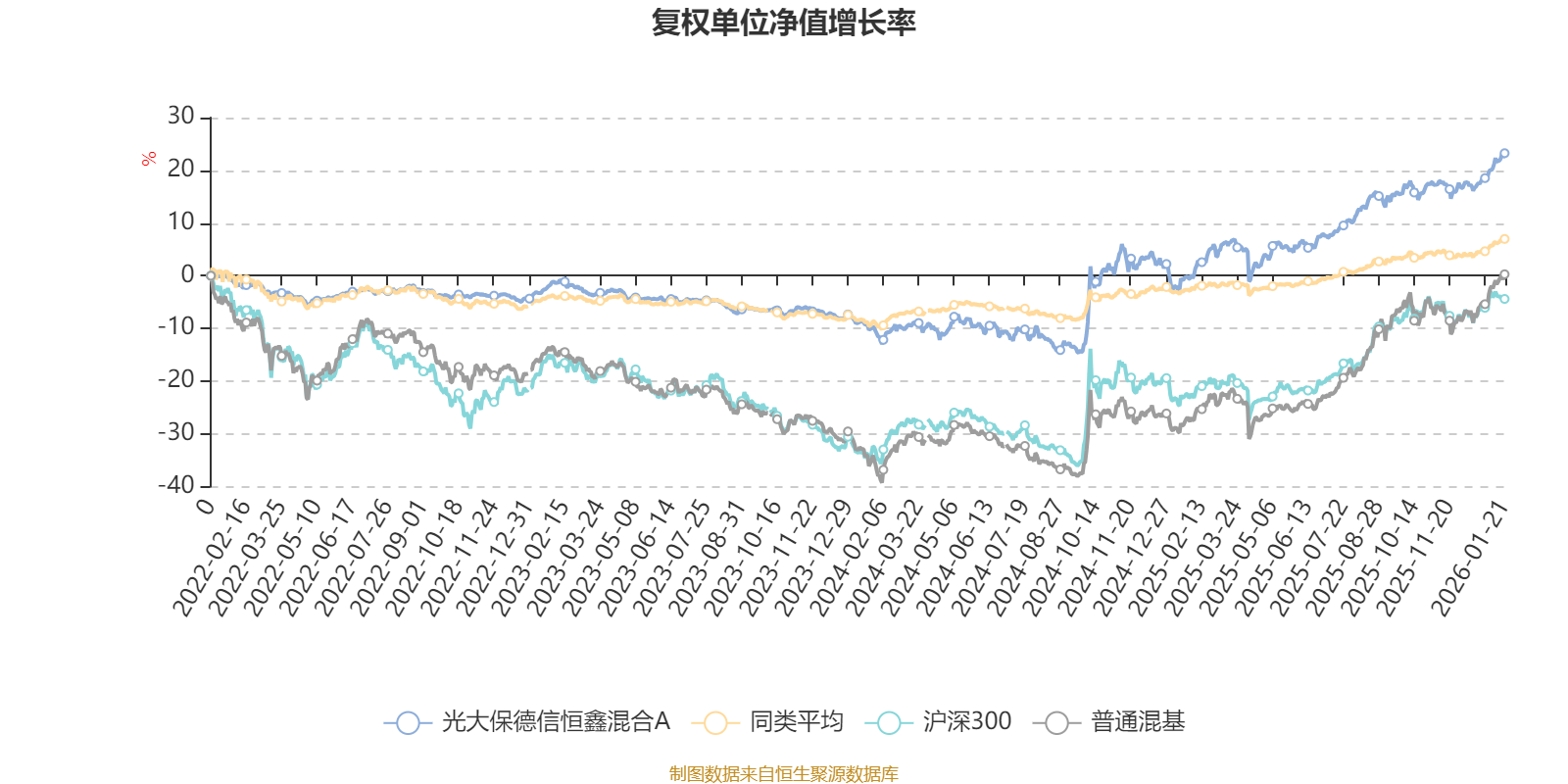 截至1月21日,光大保德信恒鑫混合A近三个月复权单位净值增长率为6.49%,位于同类可比基金31/629;近半年复权单位净值增长率为12.47%,位于同类可比基金45/629;近一年复权单位净值增长率为23.40%,位于同类可比基金28/626;近三年复权单位净值增长率为25.90%,位于同类可比基金44/564。