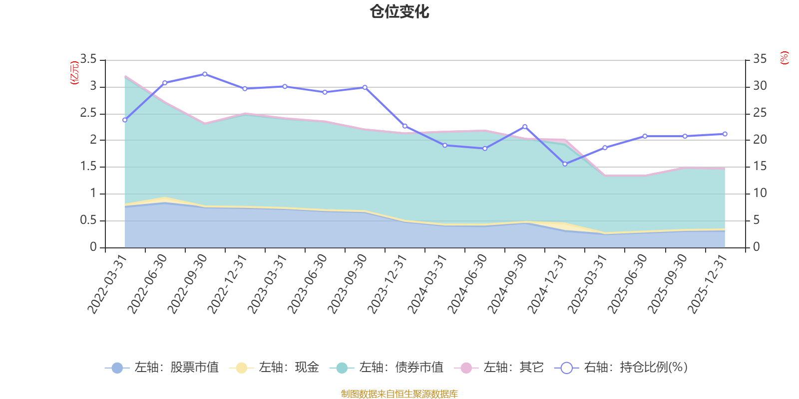 据定期报告数据统计,近三年平均股票仓位为22.38%,同类平均为19.2%。2022年三季度末基金达到32.35%的最高仓位,2024年末最低,为15.59%。