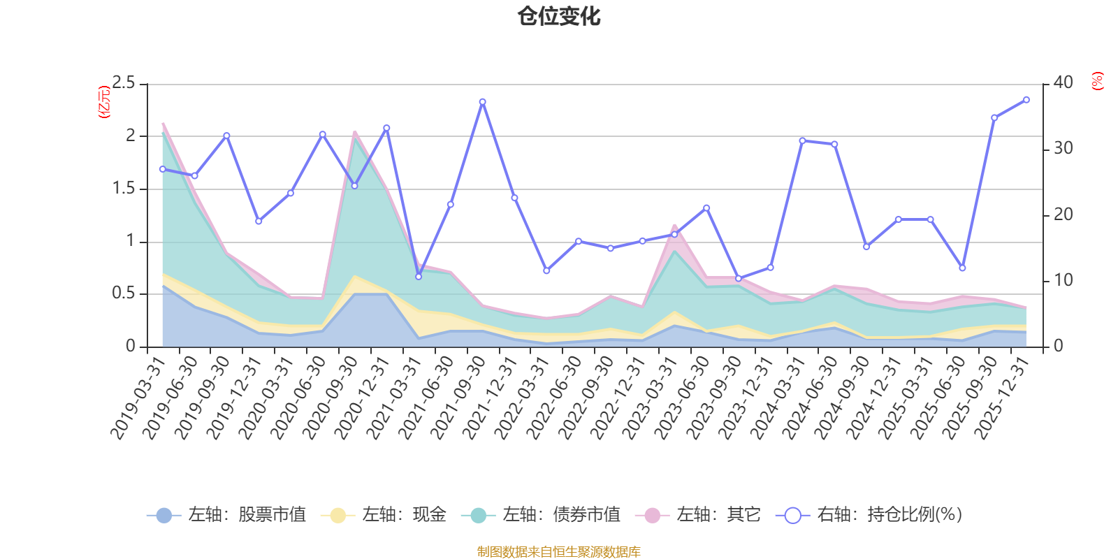 据定期报告数据统计,近三年平均股票仓位为21.78%,同类平均为19.2%。2025年末基金达到37.58%的最高仓位,2023年三季度末最低,为10.41%。