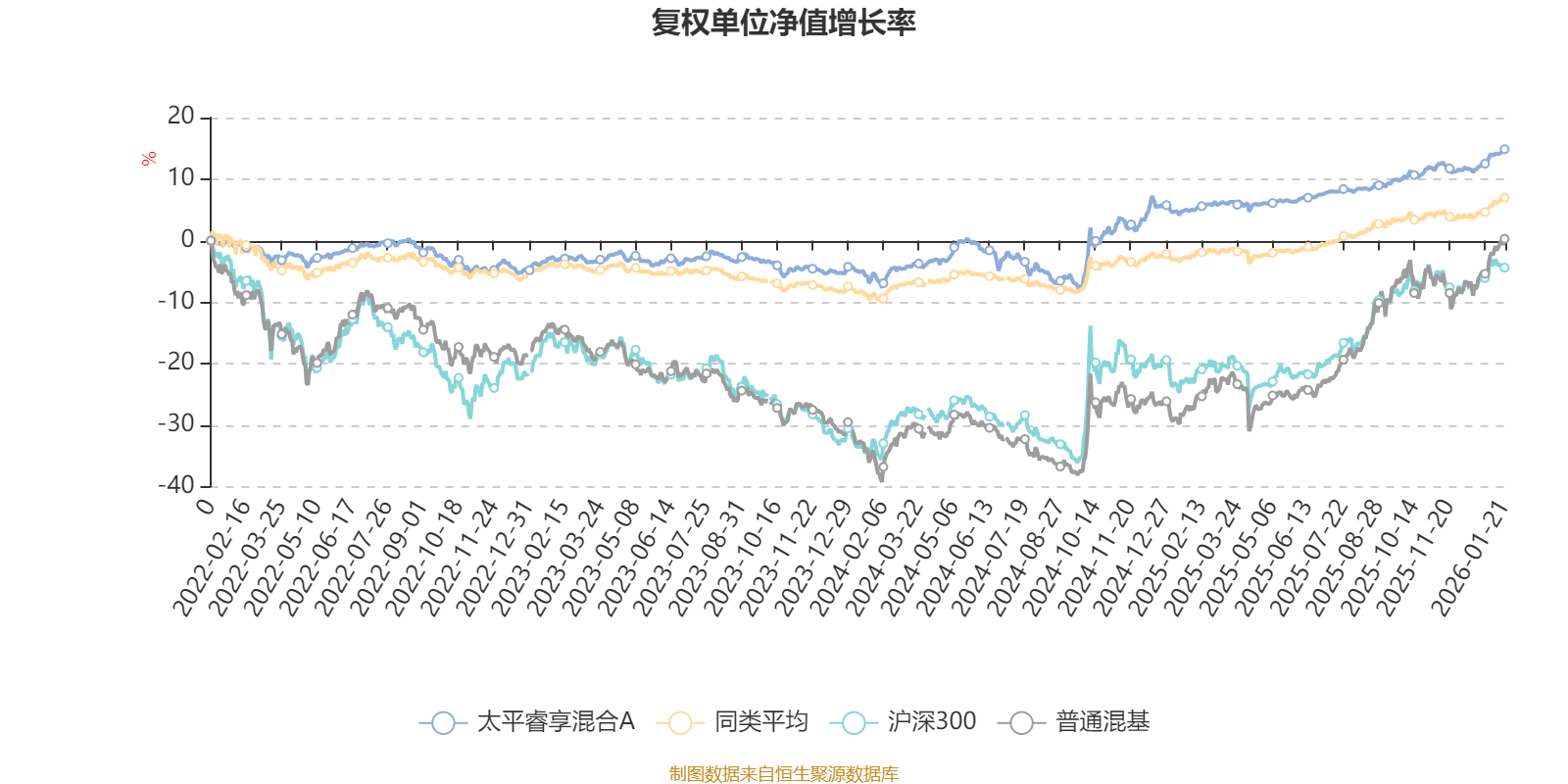 截至1月21日,太平睿享混合A近三个月复权单位净值增长率为3.73%,位于同类可比基金125/629;近半年复权单位净值增长率为6.08%,位于同类可比基金199/629;近一年复权单位净值增长率为9.44%,位于同类可比基金220/626;近三年复权单位净值增长率为18.30%,位于同类可比基金108/564。
