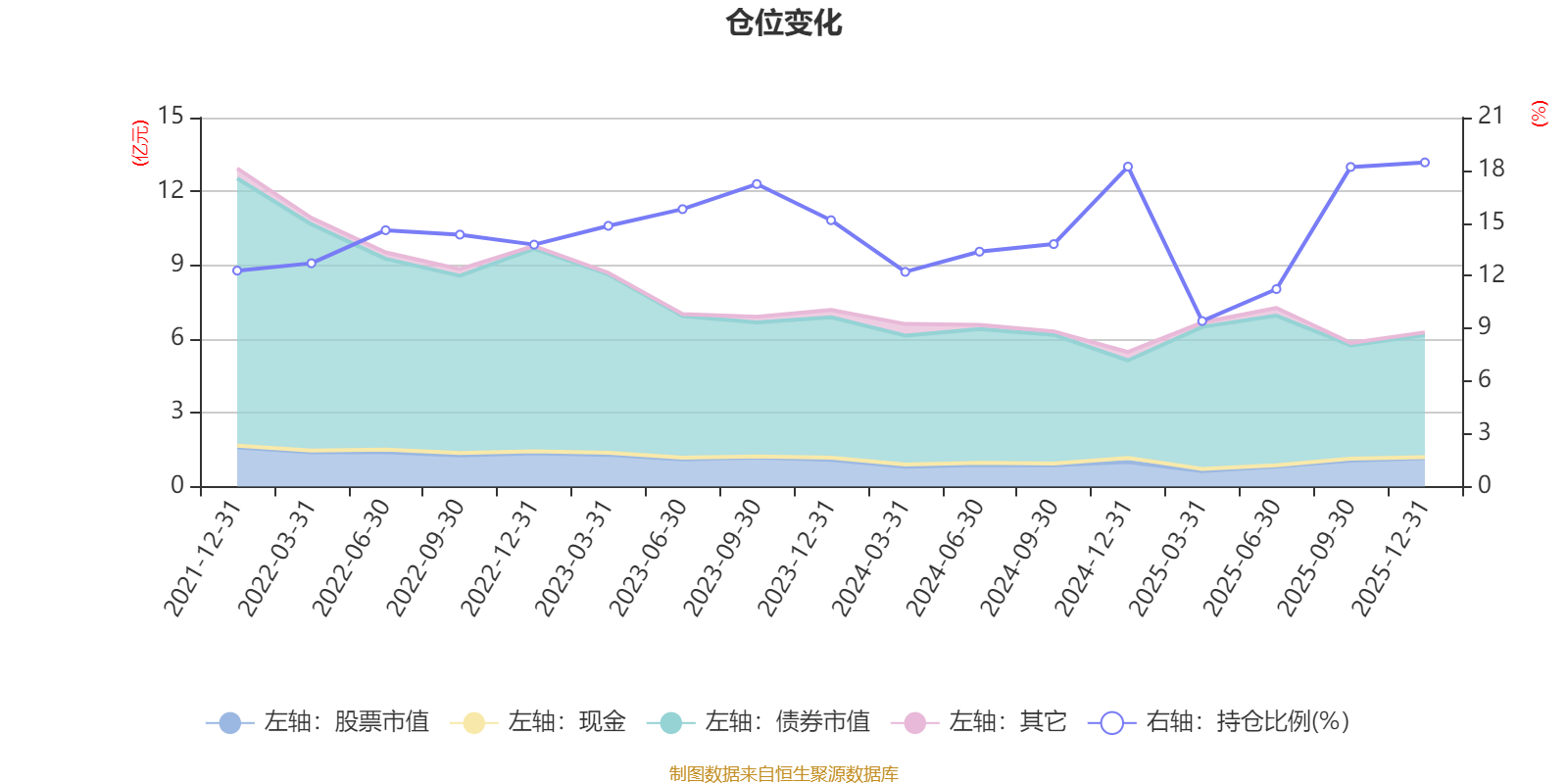据定期报告数据统计,近三年平均股票仓位为14.83%,同类平均为19.2%。2025年末基金达到18.45%的最高仓位,2025年一季度末最低,为9.42%。