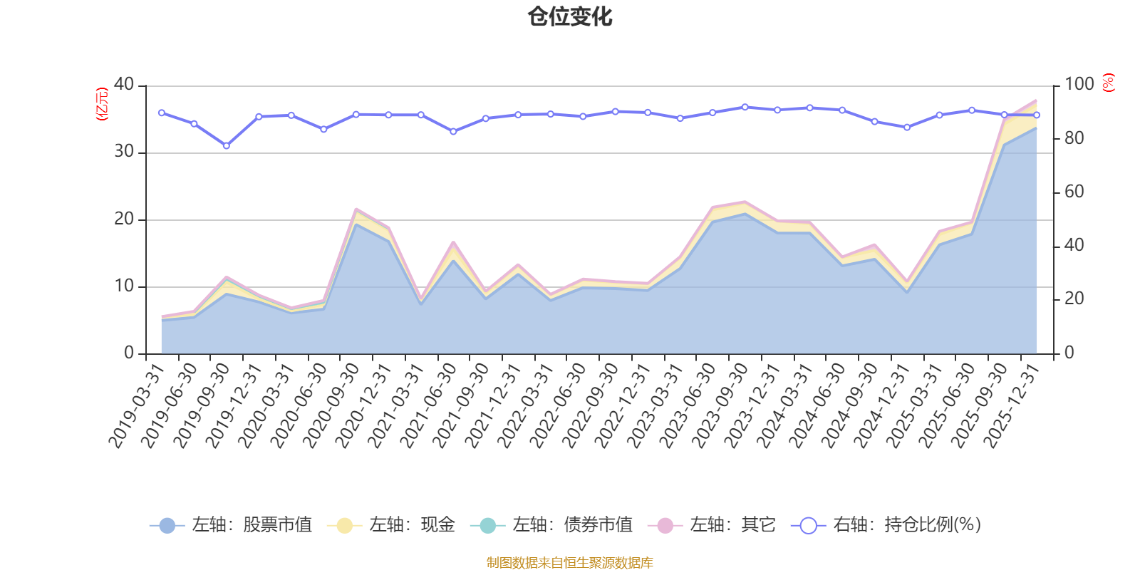 据定期报告数据统计,近三年平均股票仓位为89.32%,同类平均为72.57%。2023年三季度末基金达到91.98%的最高仓位,2019年三季度末最低,为77.55%。